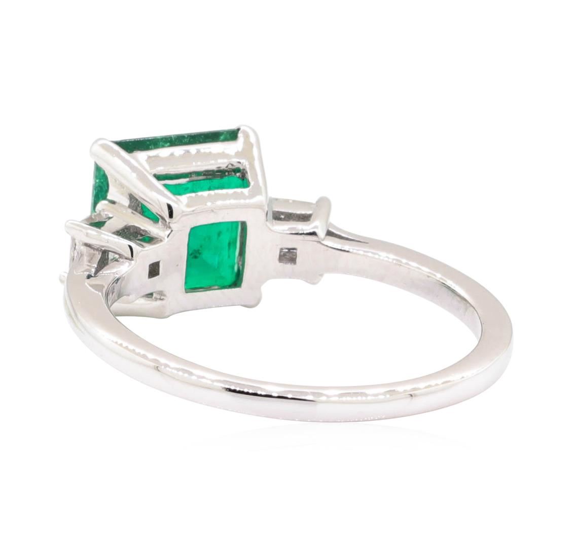 One electronically tested 14KT white gold Ladies cast fashion ring with a 3-stone straight line with a bright polish finish. The featured ladies ring has a shank measuring 1.50 millimeter in width. Identified with markings of '14K'. Condition is new, good workmanship. Containing: One prong set square emerald standard step cut natural emerald, measuring 8.14 x 7.80 x 0.33mm, (depth est.) 5%. bulge factor, approximate weight of 1.87ct., clarity is moderately included, medium dark, strong, green color, (GIA G 6/5), cut is very good. Colored gemstones are presumed to have been subjected to commonly used enhancement processes. Indications of oil residue. Graded in the setting. Two prong set princess cut diamonds, measuring 2.85 x 2.70 x 2.03mm (depth est.) approximate total weight of 2 Stones = 0.24ct. Graded in the setting. Color G - H Clarity VS-2 to SI-1 Cut Very Good. Total Weight of Colored Stones 1.87ct.. Total Weight of Diamonds 0.24ct.. Total Weight of Ring 3.00gm. GAS Appraised.