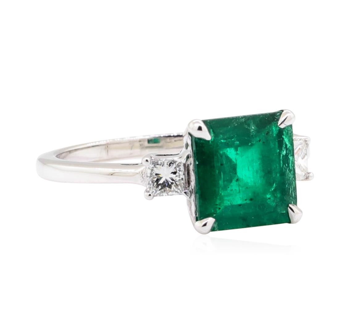 One electronically tested 14KT white gold Ladies cast fashion ring with a 3-stone straight line with a bright polish finish. The featured ladies ring has a shank measuring 1.50 millimeter in width. Identified with markings of '14K'. Condition is new, good workmanship. Containing: One prong set square emerald standard step cut natural emerald, measuring 8.14 x 7.80 x 0.33mm, (depth est.) 5%. bulge factor, approximate weight of 1.87ct., clarity is moderately included, medium dark, strong, green color, (GIA G 6/5), cut is very good. Colored gemstones are presumed to have been subjected to commonly used enhancement processes. Indications of oil residue. Graded in the setting. Two prong set princess cut diamonds, measuring 2.85 x 2.70 x 2.03mm (depth est.) approximate total weight of 2 Stones = 0.24ct. Graded in the setting. Color G - H Clarity VS-2 to SI-1 Cut Very Good. Total Weight of Colored Stones 1.87ct.. Total Weight of Diamonds 0.24ct.. Total Weight of Ring 3.00gm. GAS Appraised.