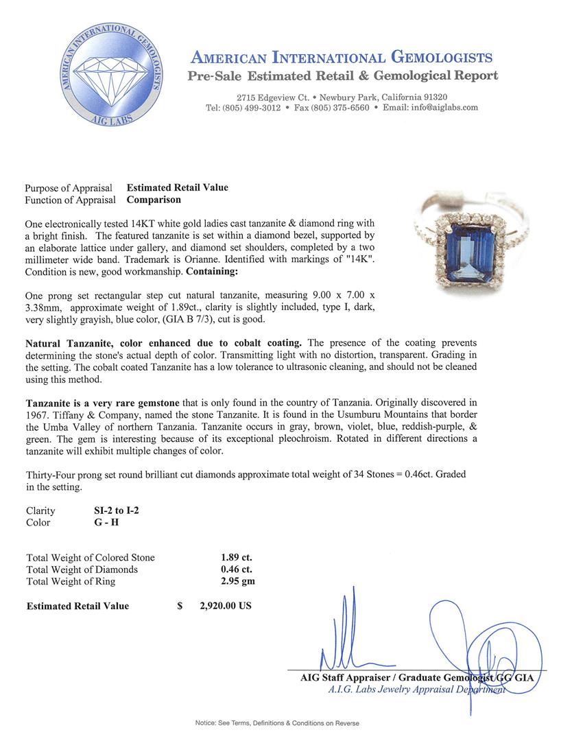One electronically tested 14KT white gold ladies cast tanzanite & diamond ring with a bright finish. The featured tanzanite is set within a diamond bezel, supported by an elaborate lattice under gallery, and diamond set shoulders, completed by a two millimeter wide band. Trademark is Orianne. Identified with markings of "14K". Condition is new, good workmanship. Containing: One prong set rectangular step cut natural tanzanite, measuring 9.00 x 7.00 x 3.38mm, approximate weight of 1.89ct., clarity is slightly included, type I, dark, very slightly grayish, blue color, (GIA B 7/3), cut is good. Natural Tanzanite, color enhanced due to cobalt coating. The presence of the coating prevents determining the stone's actual depth of color. Transmitting light with no distortion, transparent. Grading in the setting. The cobalt coated Tanzanite has a low tolerance to ultrasonic cleaning, and should not be cleaned using this method. Tanzanite is a very rare gemstone that is only found in the country of Tanzania. Originally discovered in 1967. Tiffany & Company, named the stone Tanzanite. It is found in the Usumburu Mountains that border the Umba Valley of northern Tanzania. Tanzanite occurs in gray, brown, violet, blue, reddish-purple, & green. The gem is interesting because of its exceptional pleochroism. Rotated in different directions a tanzanite will exhibit multiple changes of color. Thirty-Four prong set round brilliant cut diamonds approximate total weight of 34 Stones = 0.46ct. Graded in the setting. Clarity: SI-2 to I-2. Color: G - H. Total Weight of Colored Stones 1.89ct. Total Weight of Diamonds 0.46ct. Total Weight of Ring 2.95gm. AIG Appraised at $2,920.00.