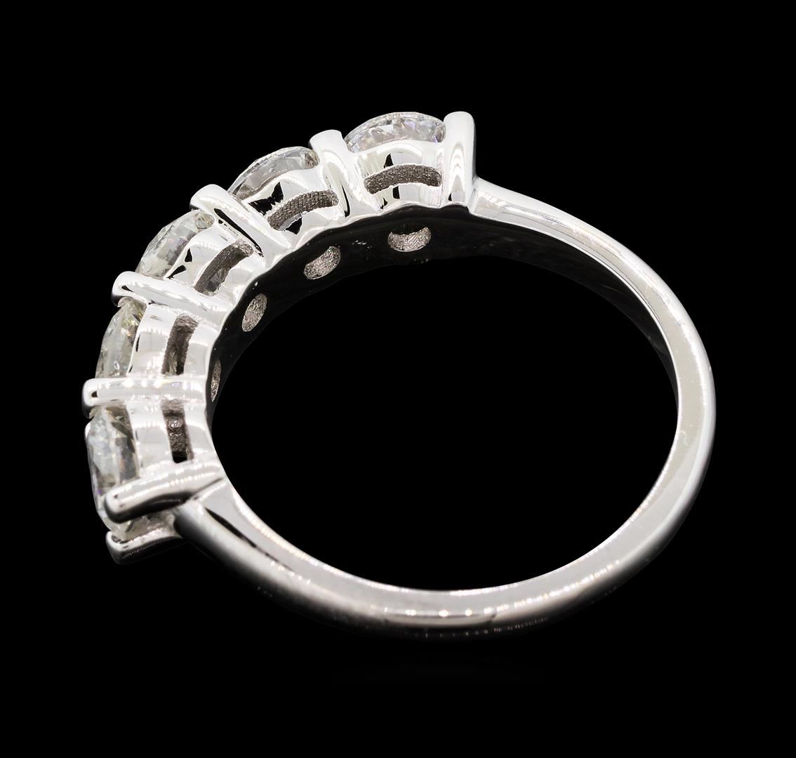 One electronically tested 14KT white gold lady's cast wedding ring with a straight line five stone motif with a bright polish finish. The featured lady's ring has a shank measuring 1.97 millimeters wide. Identified with markings of "14K". Condition is new, good workmanship. Containing: Five prong set round brilliant cut diamonds, measuring 4.78 - 4.65 x 2.88mm (depth est.) approximate. Total Weight of 5 Stones = 1.96ct. Graded in the setting. Color H - I Clarity I-1 Cut Good. Total Weight of Diamonds 1.96ct.. Total Weight of Ring 3.70gm. GAS Appraised.