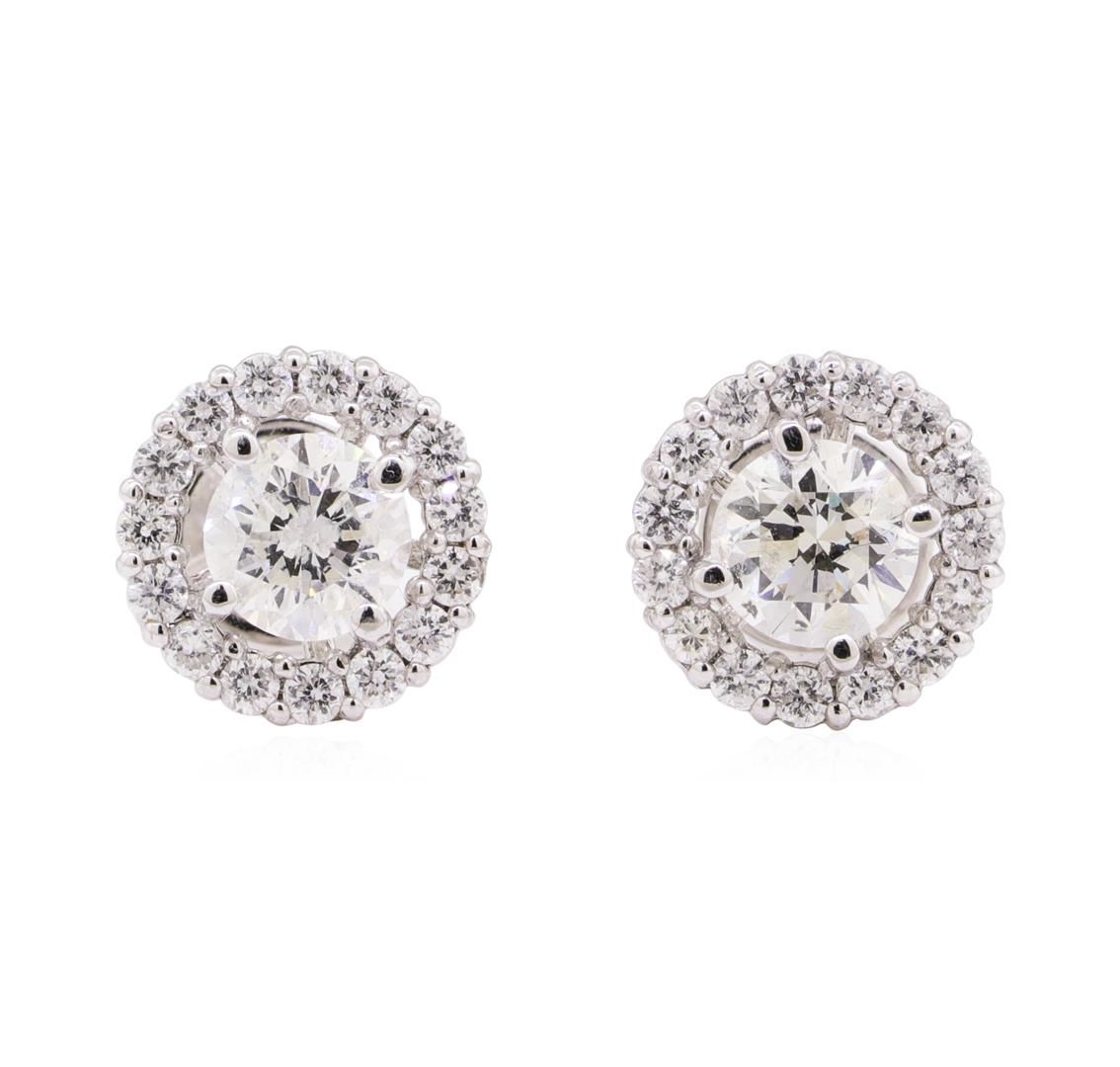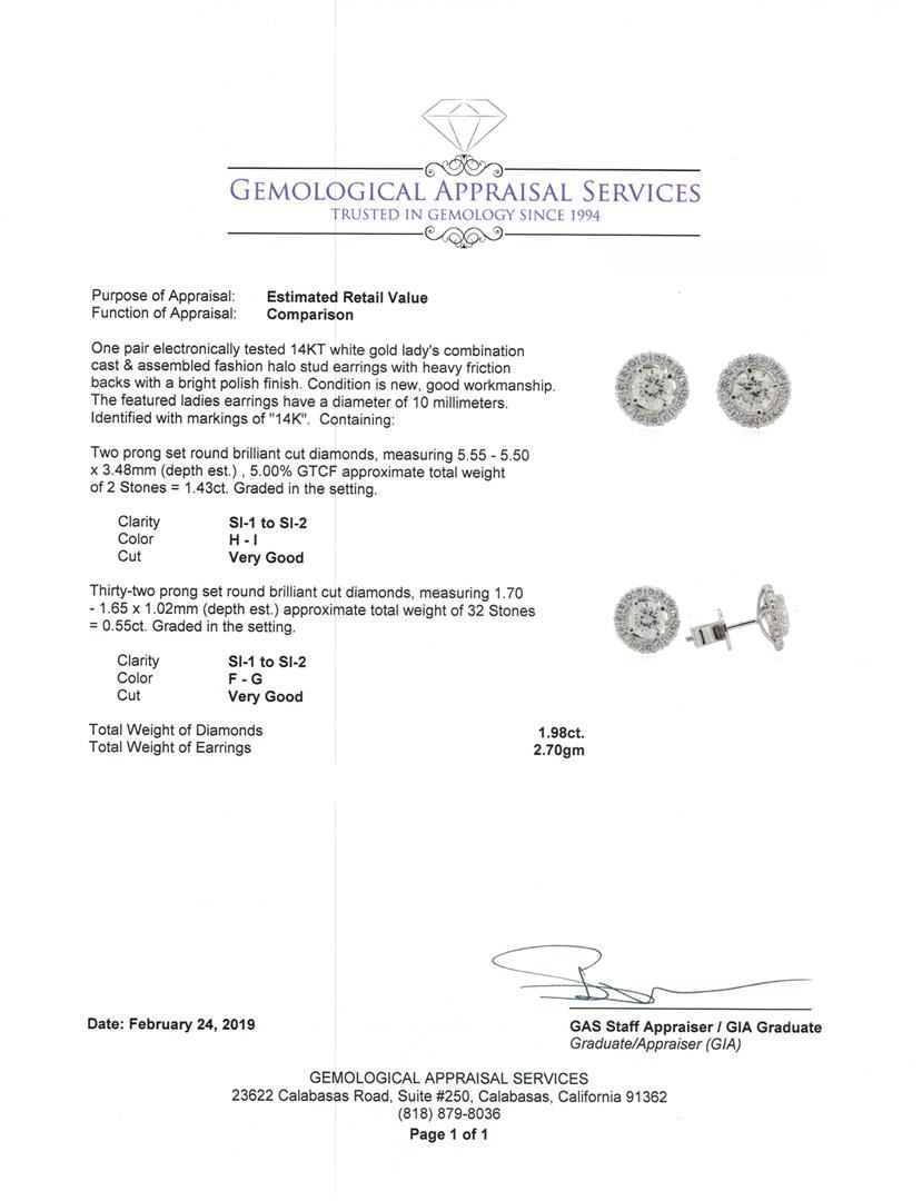 One pair electronically tested 14KT white gold lady's combination cast & assembled fashion halo stud earrings with heavy friction backs with a bright polish finish. The featured ladies earrings have a diameter of 10 millimeters. Identified with markings of '14K'. Condition is new, good workmanship. Containing: Two prong set round brilliant cut diamonds, measuring 5.55 - 5.50 x 3.48mm (depth est.) , 5.00.%. GTCF approximate total weight of 2 Stones = 1.43ct. Graded in the setting. Color H - I, Clarity SI-1 to SI-2, Cut Very Good Thirty-Two prong set round brilliant cut diamonds, measuring 1.70 - 1.65 x 1.02mm (depth est.) approximate total weight of 32 Stones = 0.55ct. Graded in the setting. Color F - G, Clarity SI-1 to SI-2, Cut Very Good. Total Weight of Diamonds 1.98ct. Total Weight of Earrings 2.70gm. GAS Appraised.