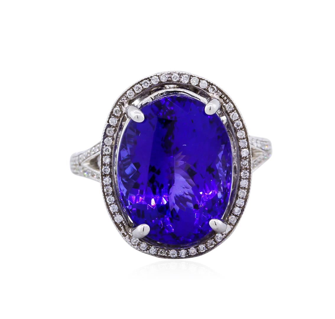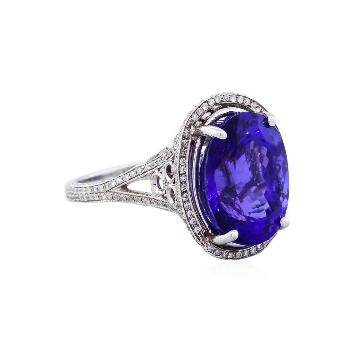 Elegant tanzanite and diamond ring set in 14KT white gold weighing 5.80 grams containing a 10.20 carat tanzanite center stone intricately framed by two hundred and ninety-two round diamonds that extend down both sides of the band with a total weight of 0.66cts.