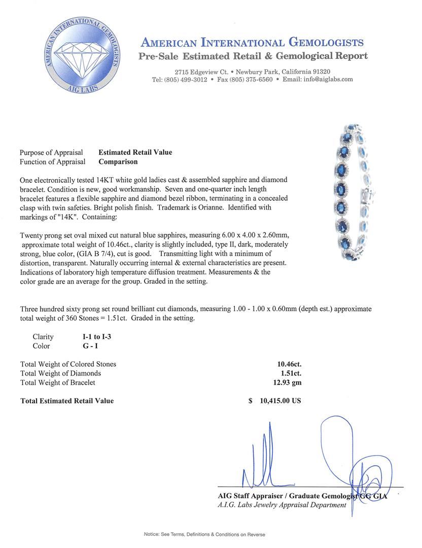 One pair electronically tested 14KT white gold ladies cast & assembled black and white diamond dangle earrings with screw backs. Each earring features a flexible graduating black diamond and white diamond bezel ribbon. Bright polish finish. Trademark is Orianne. Identified with markings of "14K". Condition is new, good workmanship. Containing: Six prong set round brilliant cut diamonds approximate total weight of 6 Stones = 11.18ct. Indications of multiple laboratory enhancements. The specific gravity of black diamond is 3.120 to 3.165. Diamond tester results are non reactive. Graded in the setting. Clarity D‚class‚. Color: Fancy Black; Irradiated. One Hundred Thirty-Four prong set single cut diamonds approximate total weight of 134 Stones = 0.70ct. Graded in the setting. Clarity: I-2 to I-3. Color: G - I. Total Weight of Diamonds 11.88ct. Total Weight of Earrings 7.03gm. AIG Appraised at $10,415.00.
