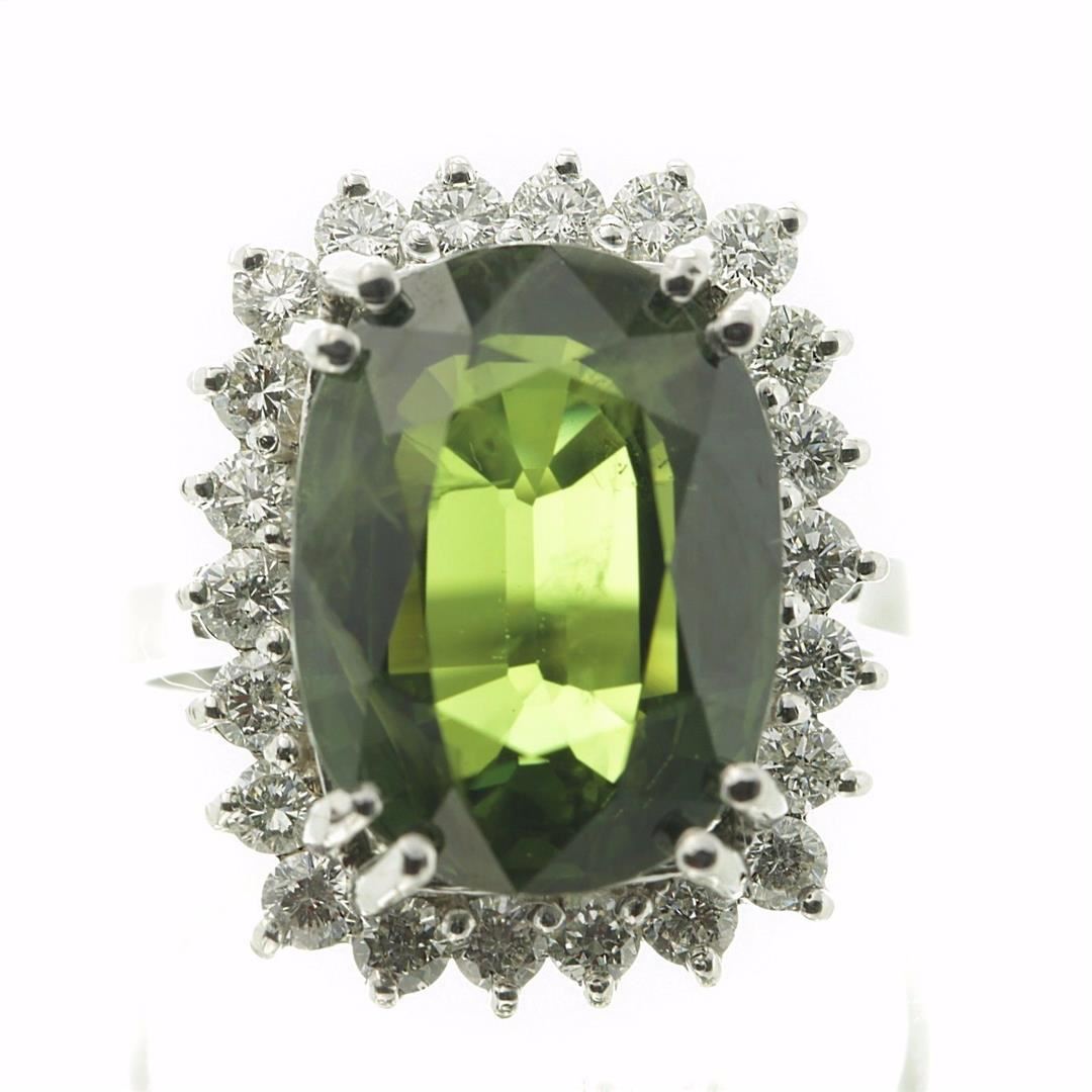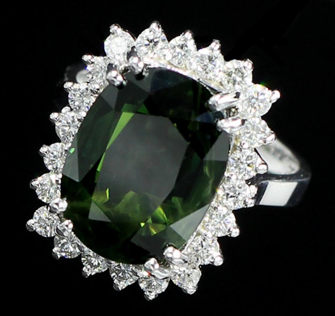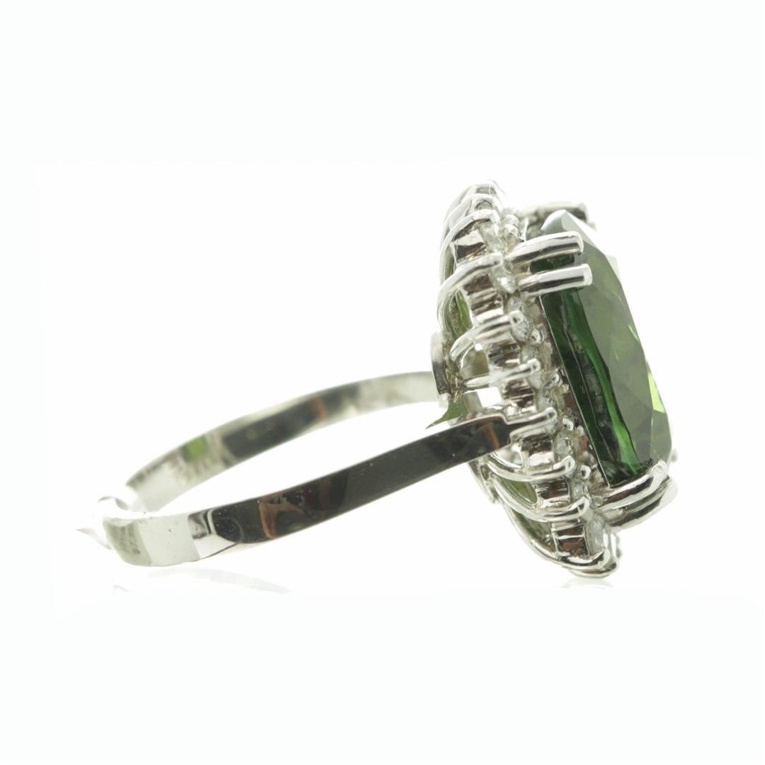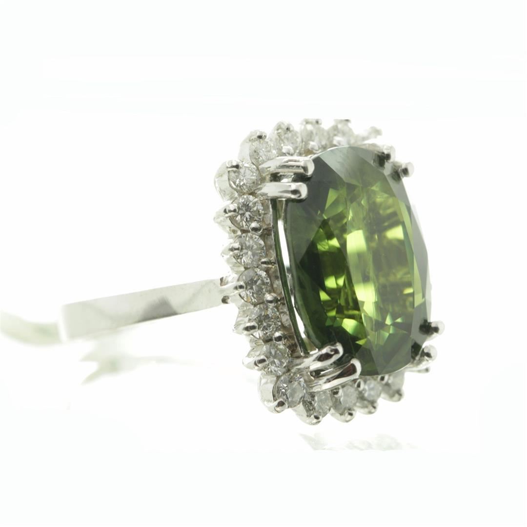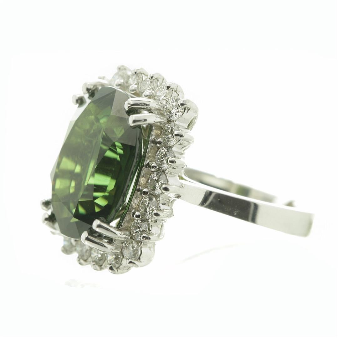 One Oval Cut Green Sapphire Anniversary Diamond Ring in 14k White Gold. Size 6.25 but resizable. Total carat weight is 10.62 Ct. Setting style is solitaire with accents / halo design. Gross weight is 7.17 grams. Total stones is 23. Condition is brand new. Main stone is natural / non-enhanced. Main stone carat is 9.75 Ct. Main stone shape is cushion cut, clarity fine deep color, color natural green, and cut is very good. Side stone is natural and non-enhanced. Total carats is 0.87 Ct. Side diamond shape is brilliant round cut, clarity SI-1, color G-H, and cut is very good.