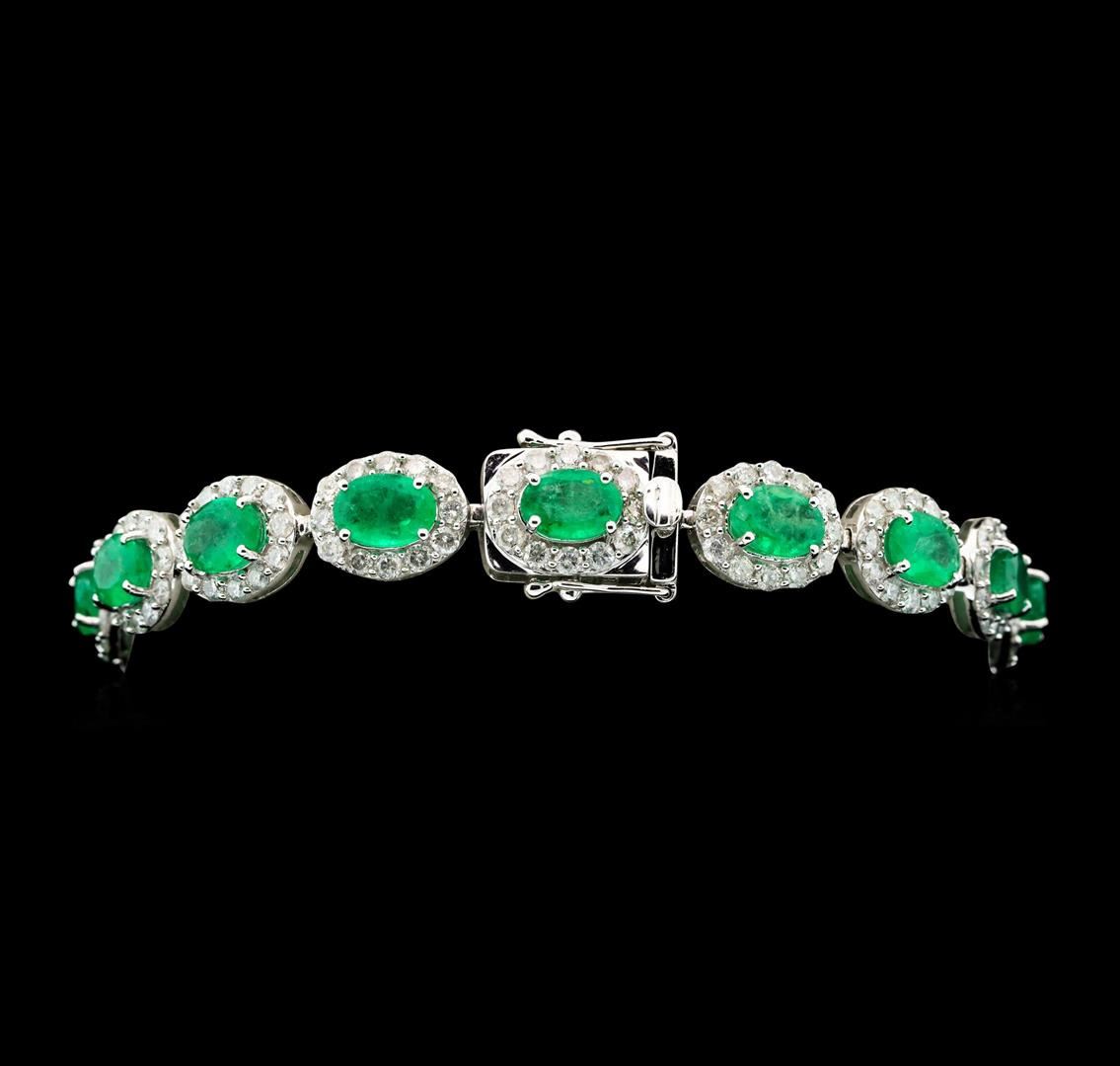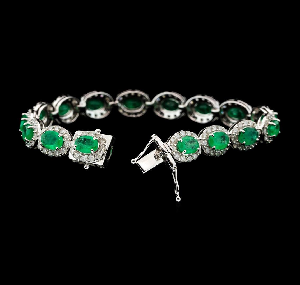 One electronically tested 14KT white gold ladies cast & assembled emerald and diamond bracelet. Seven inch length bracelet features a flexible ribbon of emeralds set within diamond bezels, terminating in a concealed clasp with twin safeties. Bright polish finish. Trademark is Orianne. Identified with markings of "14K". Condition is new, good workmanship. Containing: Sixteen prong set oval mixed cut natural emeralds approximate total weight of 10.63ct., clarity is heavily included, type III, medium dark, very slightly grayish, very slightly bluish green color, (GIA vslbG 6/3), cut is good. Transmitting light somewhat diffusely, transparent to translucent. Naturally occurring internal & external characteristics are present. Color grade is an average for the group. Indications of oil residue. Graded in the setting.One Hundred Ninety-Two prong set round brilliant cut diamonds approximate total weight of 192 Stones = 4.82ct. Graded in the setting. Clarity: I-2 to I-3. Color: F - H. Total Weight of Colored Stones 10.63ct. Total Weight of Diamonds 4.82ct. Total Weight of Bracelet 15.74gm. AIG Appraised.