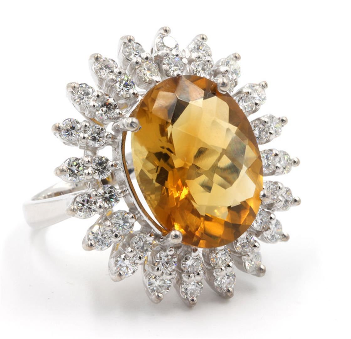 One Fancy Oval Cut Madeira Citrine Diamond Anniversary Ring in 14k White Gold. Total carat weight of ring is 10.65 Ct. Size 6.25 but resizable. Setting style is 4 prong with accent. Gross weight is 8.65 grams with a total of 41 stones. Condition is brand new. Main stone is 9.00 Ct. Main stone shape is oval, fine medium color clarity, color citrine. Size approximation of main stone is 16.45 x 13.30 MM. Main stone cut is excellent. Side stone total carat weight is 1.65 Ct. Side diamonds shape is brilliant round cut, SI1 clarity, G-H color, and cut is excellent. Number of side stones is 40.