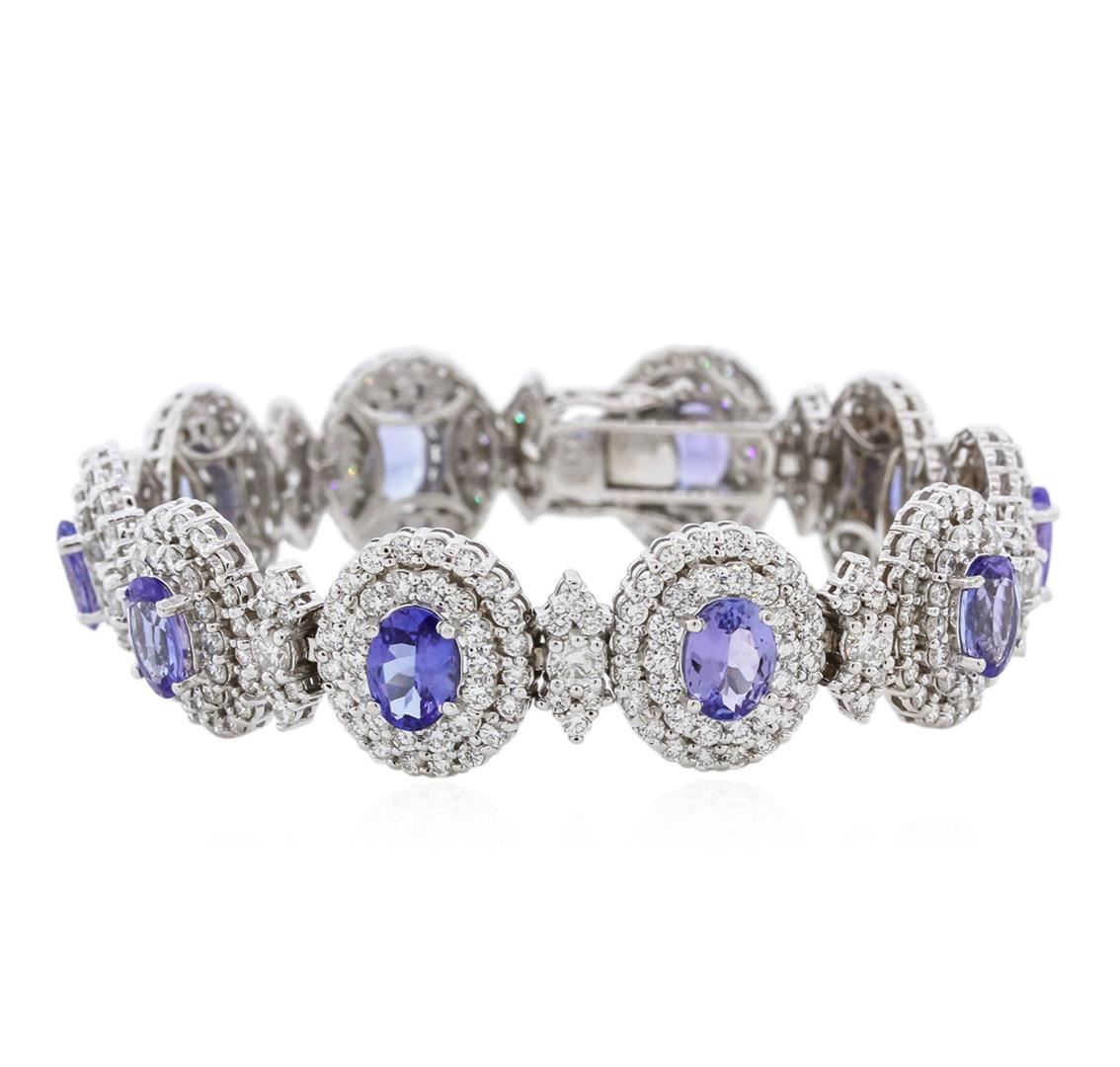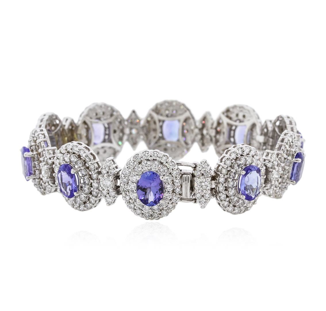 One electronically tested 14KT white gold ladies cast tanzanite and diamond bracelet with a hidden box clasp with safety closer with a bright polish finish. Measurements: 7" in length Identified with markings of "14K". Condition is new. Containing: Ten prong set oval modified brilliant cut natural tanzanites, measuring 7.90 x 5.90 x 3.84mm, approximate total weight of 11.11ct., clarity is eye clean, type I, medium light, very slightly grayish, violet color, (GIA V 4/3), cut is good. Ten prong set round brilliant cut diamonds, measuring 3.00 - 3.00 x 1.80mm (depth est.) approximate total weight of 10 Stones = 1.27ct. Clarity: SI-1 to SI-2. Color: H - I, Cut is Good. Four Hundred prong set round brilliant cut diamonds, measuring 1.90 - 1.90 x 1.14mm (depth est.) approximate total weight of 400 Stones = 8.95ct. Clarity: SI-1 to I-1. Color: H - I, Cut is Good. Colored gemstones are presumed to have been subjected to commonly used enhancement processes. All diamonds and colored gemstones are graded in the mounting, unless otherwise stated. Total Weight of Colored Stones 11.11ct. Total Weight of Diamonds 10.22ct. Total Weight of Bracelet 35.80 grams. GGL Appraised at $26,060.00.
