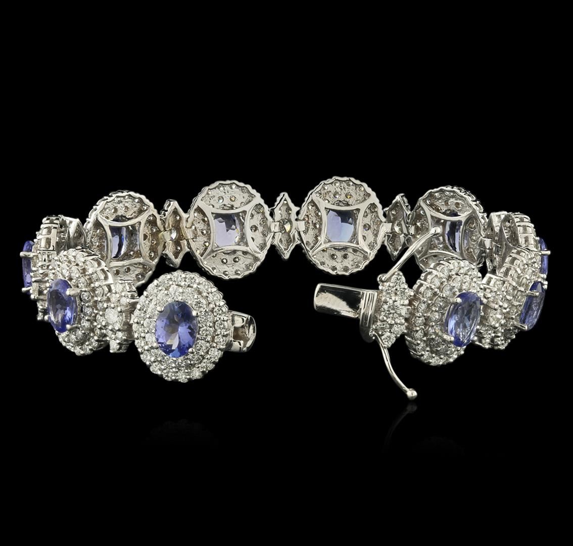 One electronically tested 14KT white gold ladies cast tanzanite and diamond bracelet with a hidden box clasp with safety closer with a bright polish finish. Measurements: 7" in length Identified with markings of "14K". Condition is new. Containing: Ten prong set oval modified brilliant cut natural tanzanites, measuring 7.90 x 5.90 x 3.84mm, approximate total weight of 11.11ct., clarity is eye clean, type I, medium light, very slightly grayish, violet color, (GIA V 4/3), cut is good. Ten prong set round brilliant cut diamonds, measuring 3.00 - 3.00 x 1.80mm (depth est.) approximate total weight of 10 Stones = 1.27ct. Clarity: SI-1 to SI-2. Color: H - I, Cut is Good. Four Hundred prong set round brilliant cut diamonds, measuring 1.90 - 1.90 x 1.14mm (depth est.) approximate total weight of 400 Stones = 8.95ct. Clarity: SI-1 to I-1. Color: H - I, Cut is Good. Colored gemstones are presumed to have been subjected to commonly used enhancement processes. All diamonds and colored gemstones are graded in the mounting, unless otherwise stated. Total Weight of Colored Stones 11.11ct. Total Weight of Diamonds 10.22ct. Total Weight of Bracelet 35.80 grams. GGL Appraised.