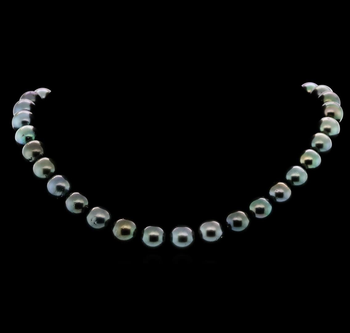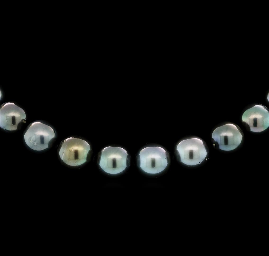 One graduated, single strand Cultured Tahitian Pearl necklace. The strand has each pearl individually hand knotted and measures 17 inches in length. The necklace is finished with a scalloped 14K White gold plunger style bead clasp. 35 pearls measuring between 11-13mm's each. Total weight of necklace is 84 grams. AIGL Appraised.