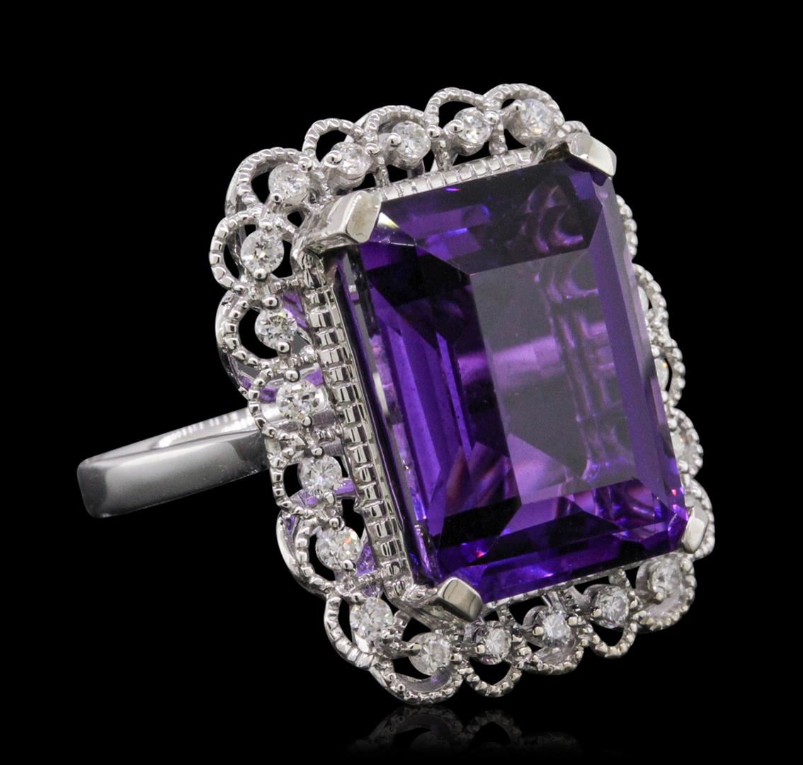 One electronically tested 14KT white gold ladies combination cast & assembled amethyst and diamond ring with a flat shank with a bright polish finish. Identified with markings of "14K". Condition is new. Containing: One prong set emerald standard step cut natural amethyst, measuring 16.09 x 12.18 x 7.92mm, approximate weight of 11.15ct., clarity is eye clean, type II, medium, moderately strong, purple color, (GIA P 5/4), cut is good. Twenty-Two prong set round brilliant cut diamonds, measuring 1.50 - 1.50 x 0.90mm (depth est.) approximate total weight of 22 Stones = 0.27ct. Clarity: I-1 to I-2. Color: I - J, Cut is Good. Colored gemstones are presumed to have been subjected to commonly used enhancement processes. All diamonds and colored gemstones are graded in the mounting, unless otherwise stated. Total Weight of Colored Stones 11.15ct. Total Weight of Diamonds 0.27ct. Total Weight of Ring 7.40 grams. GGL Appraised at $3,570.00.