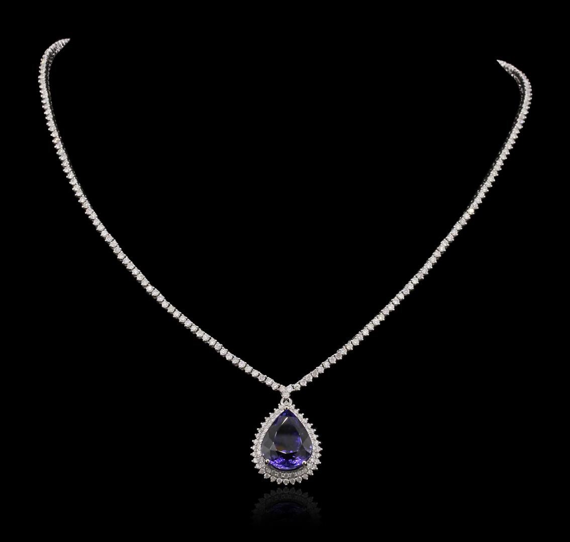 One electronically tested 14KT white gold Ladies combination cast & assembled necklace with a hidden box clasp with a bright polish finish. Condition is new. Measurements: 16" in length. Identified with markings of "14K". Containing: Two Hundred prong set round brilliant cut diamonds, measuring 1.80 - 1.80 x 1.08mm (depth est.) approximate. Total Weight of 200 Stones = 5.56ct. Clarity: I-1 to I-3. Color: G - H, Cut is Fair. Sixty-Five prong set round brilliant cut diamonds, measuring 1.30 - 1.30 x 0.78mm (depth est.) approximate. Total Weight of 65 Stones = 0.52ct. Clarity: I-2 to I-3. Color: G - H, Cut is Fair. One prong set pear modified brilliant cut natural tanzanite, measuring 15.93 x 13.07 x 8.85mm, approximate weight of 11.55ct., clarity is eye clean, type I, medium, moderately strong, bluish violet color, (GIA bV 5/4), cut is very good. GIA Report: 1156964525.Total Weight of Colored Stones 11.55ct. Total Weight of Diamonds 6.08ct. Total Weight of Necklace 22.50 grams. GGL Appraised at $33,870.00.
