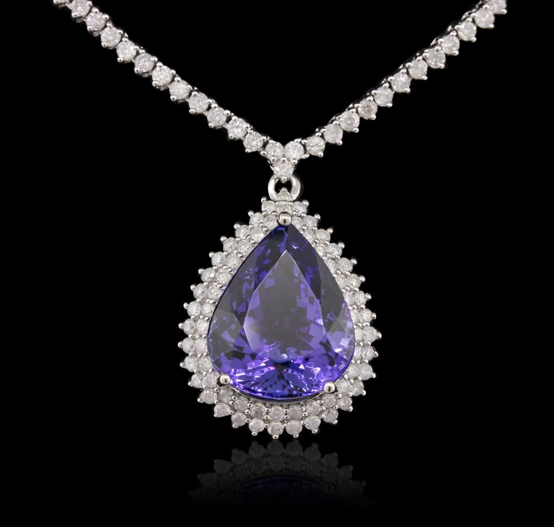 One electronically tested 14KT white gold Ladies combination cast & assembled necklace with a hidden box clasp with a bright polish finish. Condition is new. Measurements: 16" in length. Identified with markings of "14K". Containing: Two Hundred prong set round brilliant cut diamonds, measuring 1.80 - 1.80 x 1.08mm (depth est.) approximate. Total Weight of 200 Stones = 5.56ct. Clarity: I-1 to I-3. Color: G - H, Cut is Fair. Sixty-Five prong set round brilliant cut diamonds, measuring 1.30 - 1.30 x 0.78mm (depth est.) approximate. Total Weight of 65 Stones = 0.52ct. Clarity: I-2 to I-3. Color: G - H, Cut is Fair. One prong set pear modified brilliant cut natural tanzanite, measuring 15.93 x 13.07 x 8.85mm, approximate weight of 11.55ct., clarity is eye clean, type I, medium, moderately strong, bluish violet color, (GIA bV 5/4), cut is very good. GIA Report: 1156964525.Total Weight of Colored Stones 11.55ct. Total Weight of Diamonds 6.08ct. Total Weight of Necklace 22.50 grams. GGL Appraised at $33,870.00.
