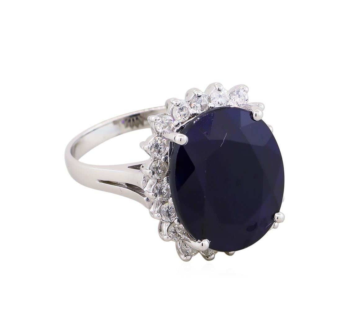 Fourteen Karat (14K) White Gold Sapphire And Diamond Ring. An Oval Cut Sapphire Corundum Gemstone Is Prong Mounted In The Center Of The Ring. Round Brilliant Cut Diamonds Accent The Ring Around The Center Gemstone. The Ring Is Cast Stamped "14K" And Has A Gross Weight Of 7.1 Grams. Diamonds: Shape: Round Brilliant Cut, Weight: 0.71 Carat, Average Clarity: Il, Average Color: H-J, Symmetry: Very Good, Polish: Very Good, Gemstone: Sapphire Corundum. Nature: Natural, Shape: Oval, Faceted, Quantity: 1 Mounted. Weight: 12.27 Carat, Center Stone Dimensions: Length-15.28 Mm.; Width-12.60 Mm. Bulge: Visible, Clarity: Si, Type 3, Color: Blue (5/5), Symmetry: Very Good, Color Intensity: Medium, Transparency: Transparent, Tone: Dark. Comments: Indications Of High Temperature And Diffusion. Metal: Gold, Stamped. Purity: 14K, Color: White, Condition: Excellent, Finish: High Polish. GGA Appraised at $4,740.00.