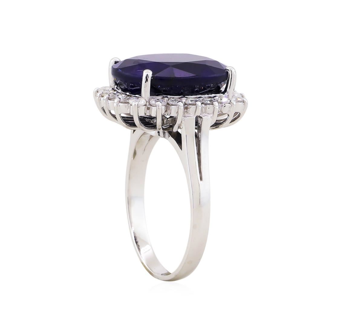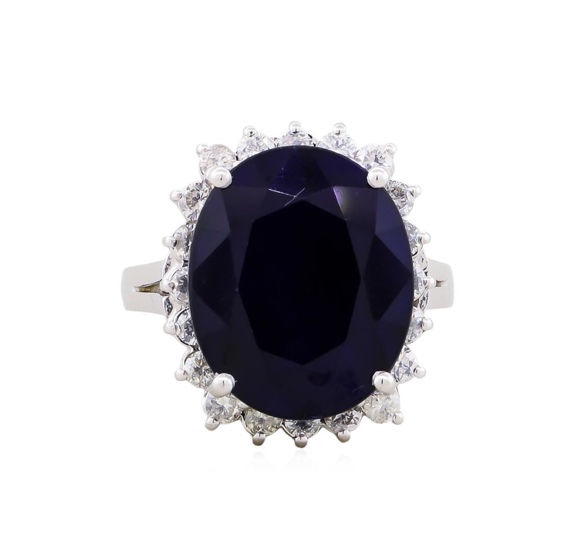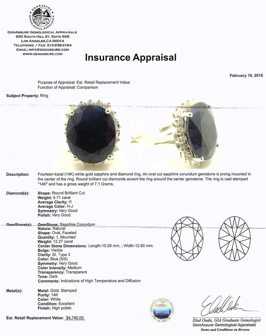 Fourteen Karat (14K) White Gold Sapphire And Diamond Ring. An Oval Cut Sapphire Corundum Gemstone Is Prong Mounted In The Center Of The Ring. Round Brilliant Cut Diamonds Accent The Ring Around The Center Gemstone. The Ring Is Cast Stamped "14K" And Has A Gross Weight Of 7.1 Grams. Diamonds: Shape: Round Brilliant Cut, Weight: 0.71 Carat, Average Clarity: Il, Average Color: H-J, Symmetry: Very Good, Polish: Very Good, Gemstone: Sapphire Corundum. Nature: Natural, Shape: Oval, Faceted, Quantity: 1 Mounted. Weight: 12.27 Carat, Center Stone Dimensions: Length-15.28 Mm.; Width-12.60 Mm. Bulge: Visible, Clarity: Si, Type 3, Color: Blue (5/5), Symmetry: Very Good, Color Intensity: Medium, Transparency: Transparent, Tone: Dark. Comments: Indications Of High Temperature And Diffusion. Metal: Gold, Stamped. Purity: 14K, Color: White, Condition: Excellent, Finish: High Polish. GGA Appraised at $4,740.00.