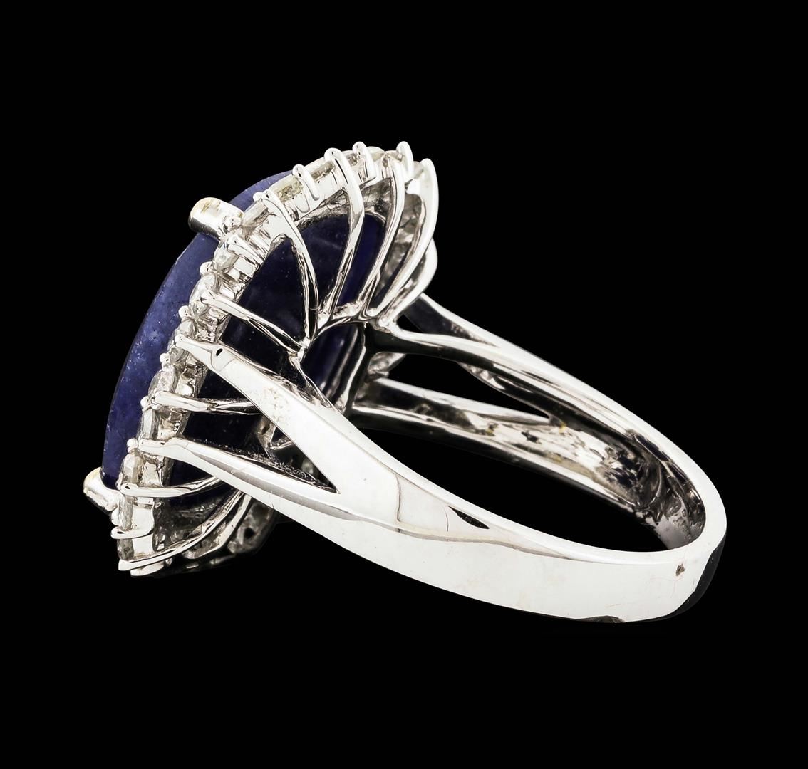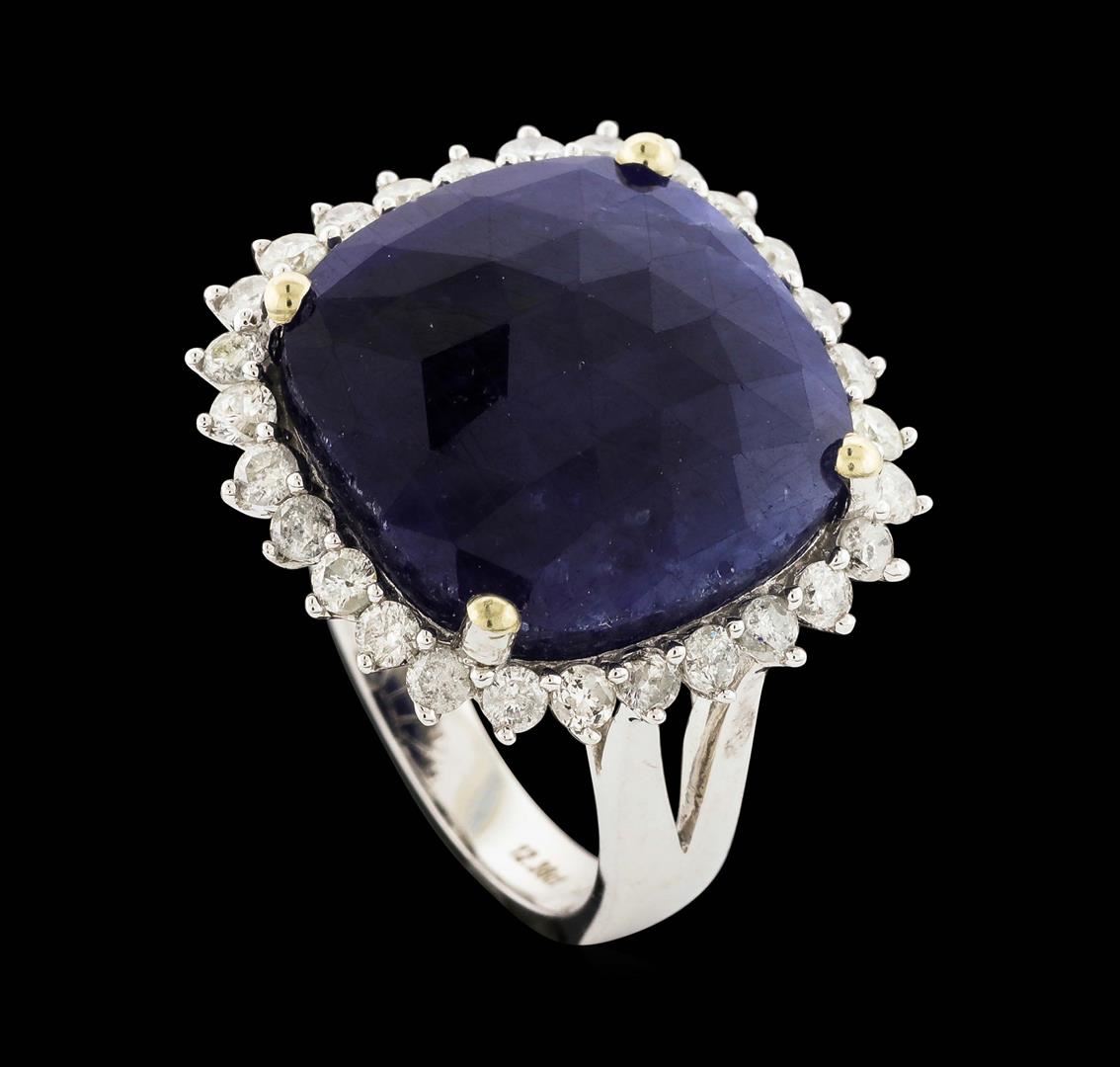 One electronically tested 14KT white gold ladies cast sapphire and diamond ring with a bright polish finish. The featured sapphire is set within a diamond bezel supported by split shoulders, completed by a three millimeter wide band. Trademark is Orianne. Identified with markings of "14K". Condition is new, good workmanship. Containing: One prong set square cushion mixed cut natural blue sapphire, measuring 15.70 x 15.70 x 4.10mm, 20%. bulge factor, approximate weight of 12.36ct., type II, medium dark, very slightly grayish, violetish blue color, (GIA vB 6/3), cut is good. Transmitting light diffusely, translucent to opaque. Naturally occurring internal & external characteristics are present. No evidence of laboratory high temperature treatment was detected. Gradedin the setting. Twenty-Eight prong set round brilliant cut diamonds, measuring 2.00 - 2.00 x 1.20mm (depth est.) approximate total weight of 28 Stones = 0.93ct. Graded in the setting. Clarity: I-1 to I-2. Color: G - I. Total Weight of Colored Stones 12.36ct. Total Weight of Diamonds 0.93ct. Total Weight of Ring 7.69gm. AIG Appraised at $5,450.00.