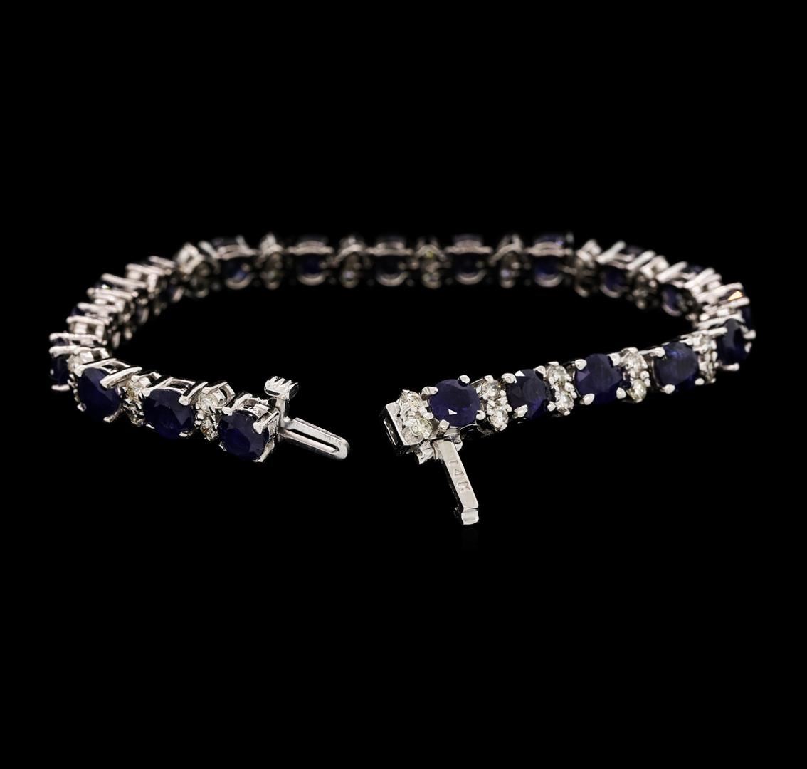 One electronically tested 14KT white gold lady's combination cast & assembled fashion tennis bracelet with a tongue clasp with foldover safety with a bright polish finish. The featured lady's bracelet measures six and a quarter inches in length. Identified with markings of "14K". Condition is new, good workmanship. Containing: Twenty prong set round modified brilliant cut natural blue sapphires, measuring 5.17 - 4.80 x 2.90 mm, (depth est.) approximate. Total Weight of 12.40ct., clarity is heavily included, dark, very slightly grayish, blue color, (GIA B 7/3), cut is good. Transmitting light somewhat diffusely, semi-transparent to translucent. Indications of laboratory high temperature heat treatment. Colored gemstones are presumed to have been subjected to commonly used enhancement processes. Graded in the setting. Forty prong set round brilliant cut diamonds, measuring 2.10 - 2.00 x 1.27mm (depth est.) approximate. Total Weight of 40 Stones = 1.30ct. Graded in the setting. Color I - KClarity SI-1 to I-1 Cut Good. Total Weight of Colored Stones 12.40ct.. Total Weight of Diamonds 1.30ct.. Total Weight of Bracelet 17.10gm. GAS Appraised.