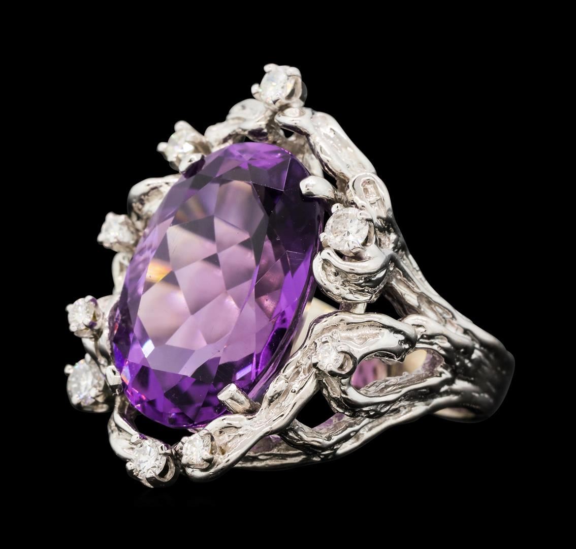 One electronically tested 14KT white gold lady's cast fashion ring with a basket halo with a bright polish with bark finish. The featured lady's ring has a shank measuring 4.05 millimeters wide. Identified with markings of "14K". Condition is like new, good workmanship. Containing: One prong set oval modified brilliant cut natural amethyst, measuring 18.30 x 13.20 x 9.28mm, (depth est.) approximate weight of 12.50ct., clarity is eye clean, medium light, moderately strong, purple color, (GIA P 4/4), cut is very good. Transmitting light with no distortion, transparent. Colored gemstones are presumed to have been subjected to commonly used enhancement processes. Graded in the setting. Two prong set round brilliant cut diamonds, measuring 2.90 - 2.80 x 1.77mm (depth est.) approximate. Total Weight of 2 Stones = 0.18ct. Graded in the setting. Color H - I Clarity SI-1 to SI-2 Cut Good Seven prong set round brilliant cut diamonds, measuring 2.50 - 2.00 x 1.40mm (depth est.) approximate. Total Weight of 7 Stones = 0.32ct. Graded in the setting. Color H - I Clarity SI-1 to SI-2 Cut Good. Total Weight of Colored Stones 12.50ct.. Total Weight of Diamonds 0.50ct.. Total Weight of Ring 13.70gm. GAS Appraised.