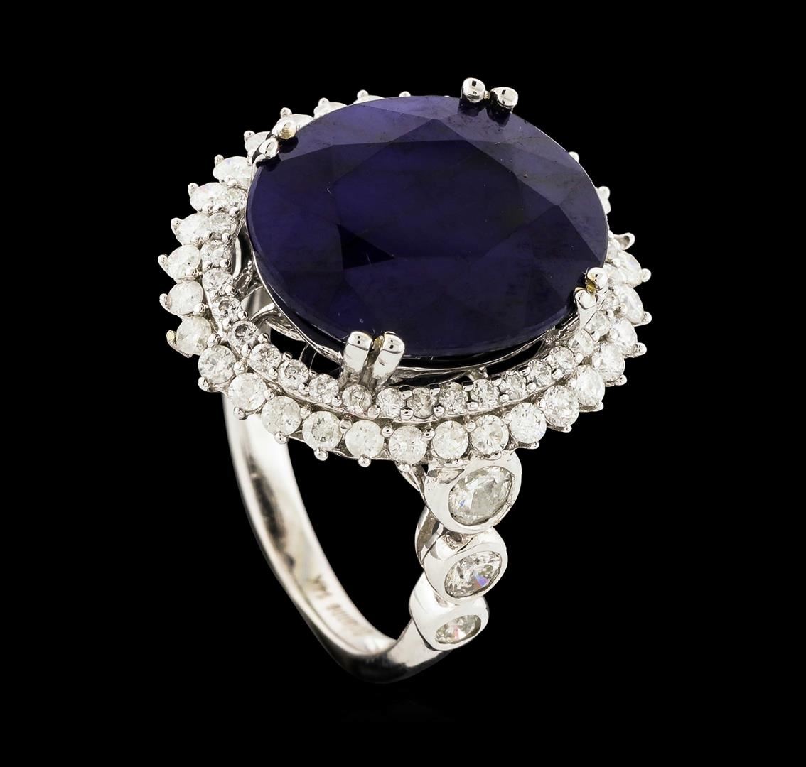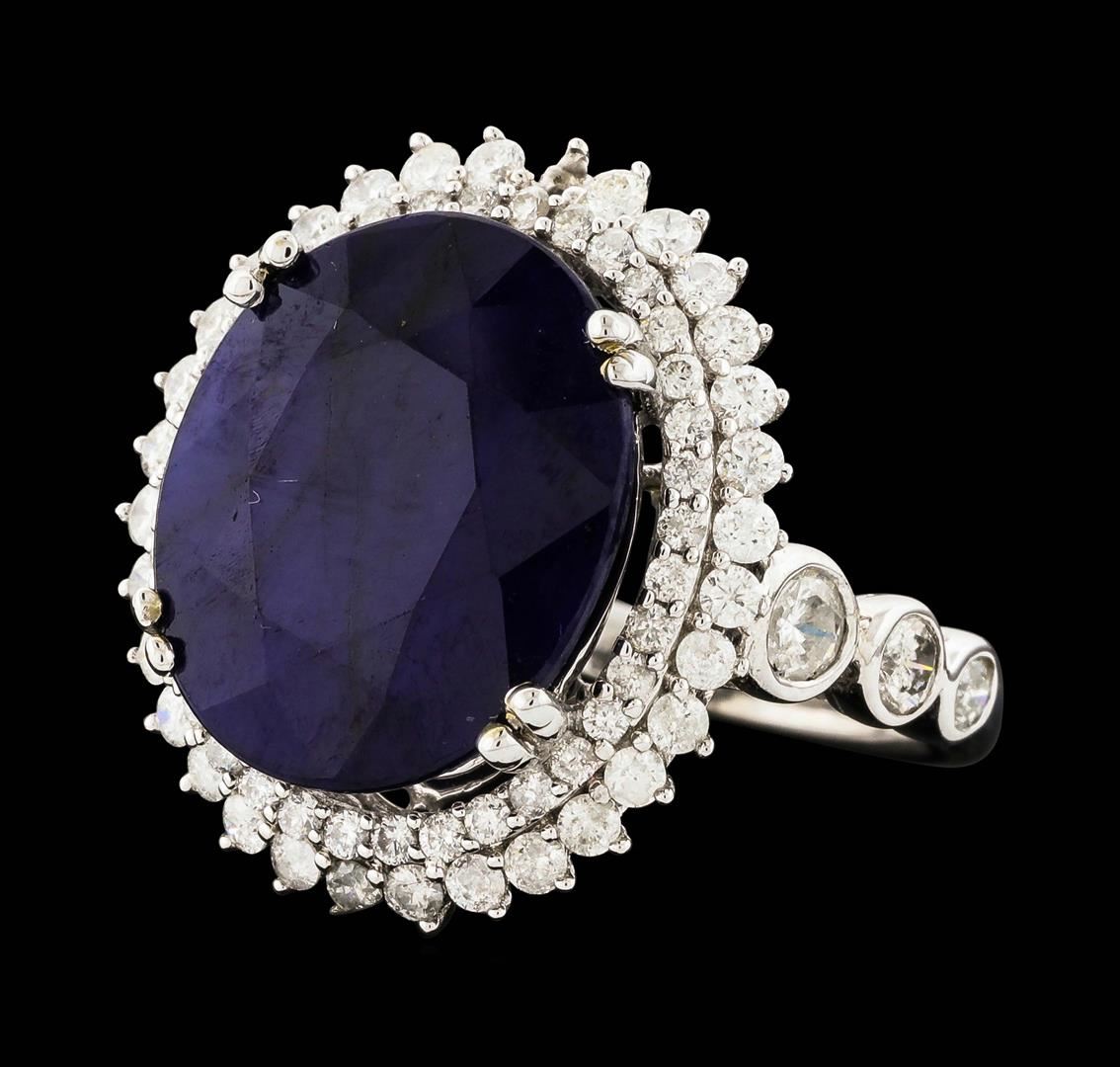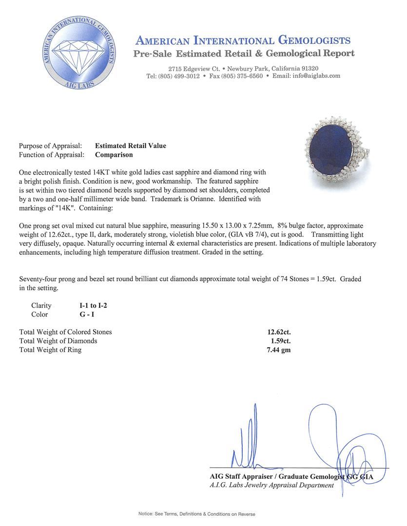 One electronically tested 14KT white gold ladies cast sapphire and diamond ring with a bright polish finish. The featured sapphire is set within two tiered diamond bezels supported by diamond set shoulders, completed by a two and one-half millimeter wide band. Trademark is Orianne. Identified with markings of "14K". Condition is new, good workmanship. Containing: One prong set oval mixed cut natural blue sapphire, measuring 15.50 x 13.00 x 7.25mm, 8%. bulge factor, approximate weight of 12.62ct., type II, dark, moderately strong, violetish blue color, (GIA vB 7/4), cut is good. Transmitting light very diffusely, opaque. Naturally occurring internal & external characteristics are present. Indications of multiple laboratory enhancements, including high temperature diffusion treatment. Graded in the setting. Seventy-Four prong and bezel set round brilliant cut diamonds approximate total weight of 74 Stones = 1.59ct. Graded in the setting. Clarity: I-1 to I-2. Color: G - I. Total Weight of Colored Stones 12.62ct. Total Weight of Diamonds 1.59ct. Total Weight of Ring 7.44gm. AIG Appraised.