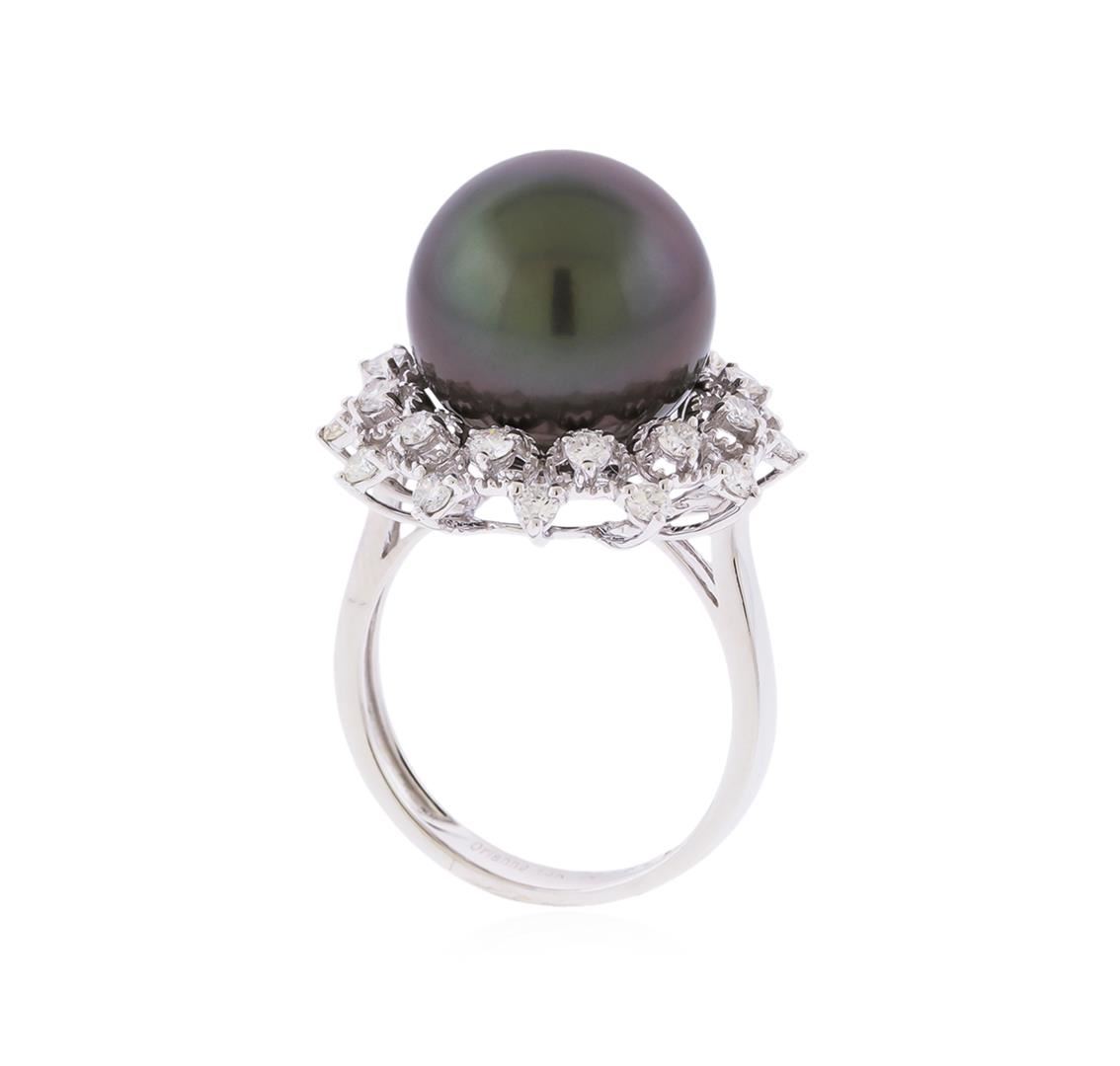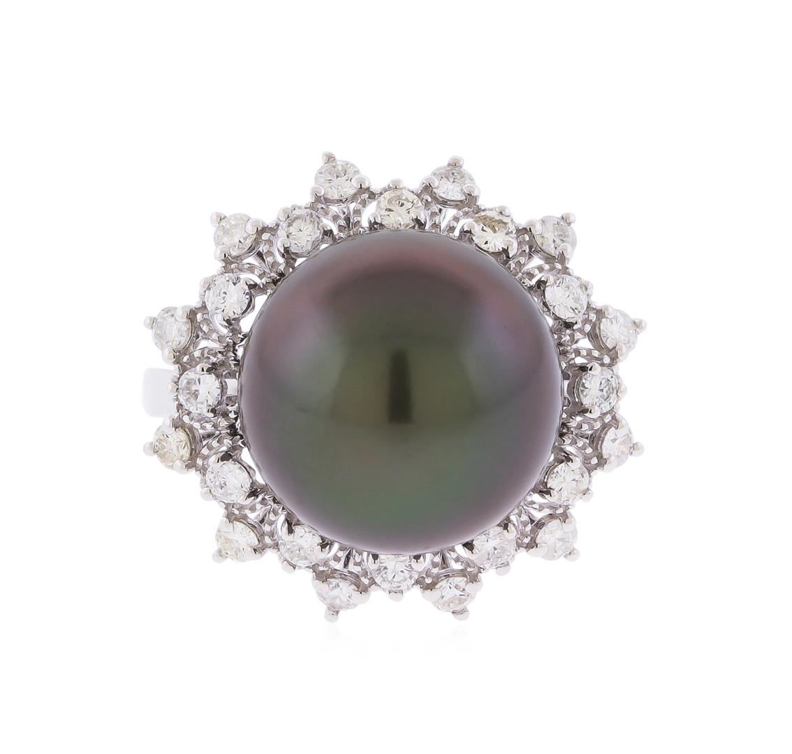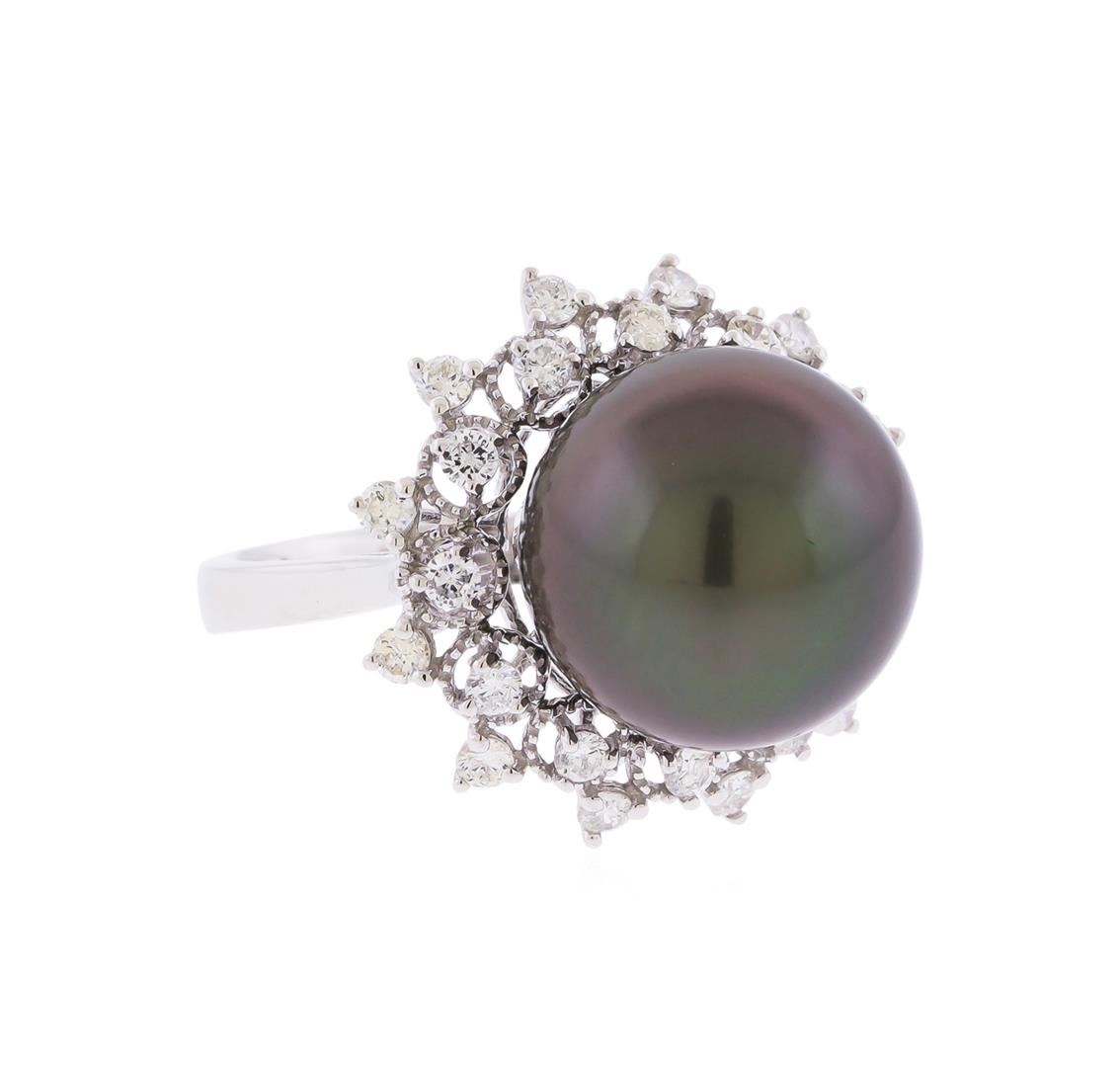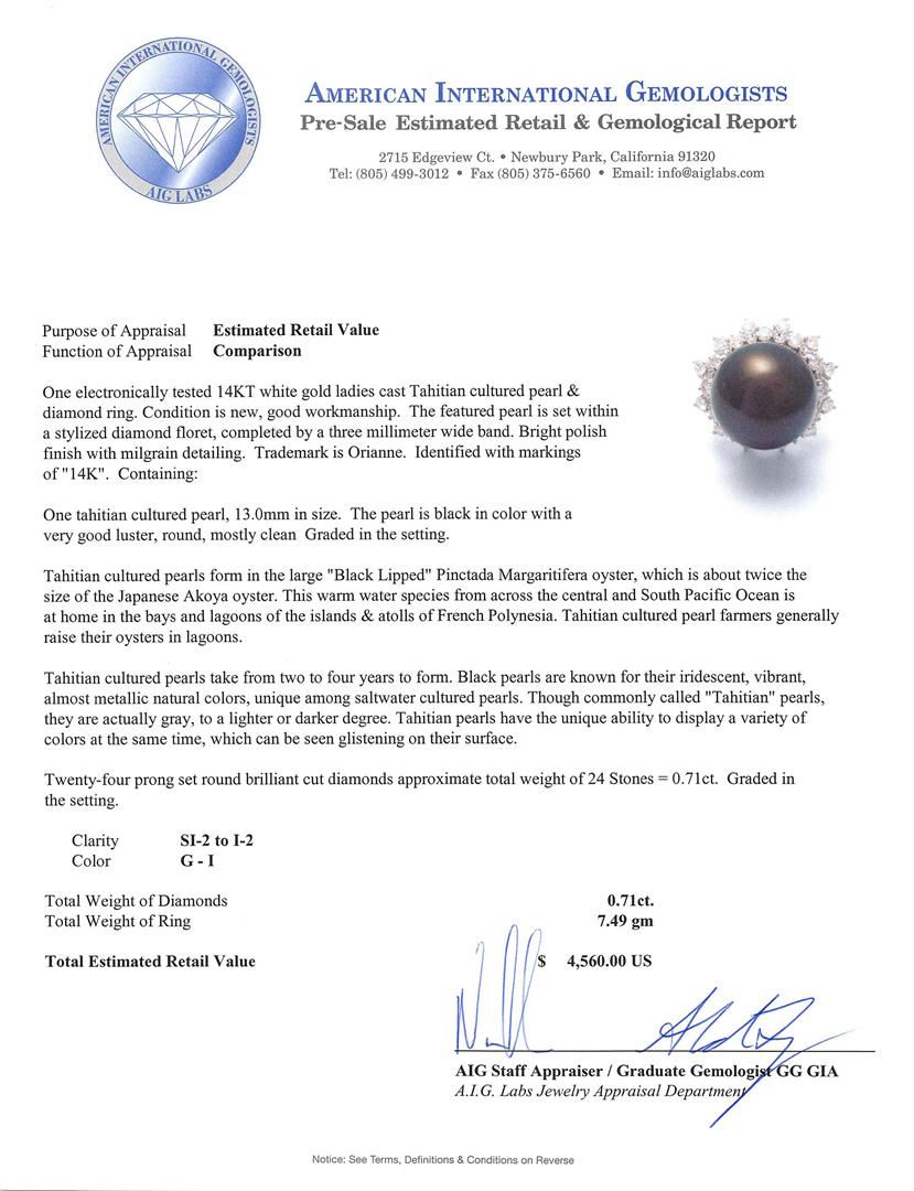 One electronically tested 14KT white gold ladies cast Tahitian cultured pearl & diamond ring. The featured pearl is set within a stylized diamond floret, completed by a three millimeter wide band. Bright polish finish with milgrain detailing. Trademark is Orianne. Identified with markings of "14K". Condition is new, good workmanship. Containing: One tahitian cultured pearl, 13.0mm in size. The pearl is black in color with a very good luster, round, mostly clean Graded in the setting.Tahitian cultured pearls form in the large "Black Lipped" Pinctada Margaritifera oyster, which is about twice the size of the Japanese Akoya oyster. This warm water species from across the central and South Pacific Ocean is at home in the bays and lagoons of the islands & atolls of French Polynesia. Tahitian cultured pearl farmers generally raise their oysters in lagoons.Tahitian cultured pearls take from two to four years to form. Black pearls are known for their iridescent, vibrant, almost metallic natural colors, unique among saltwater cultured pearls. Though commonly called "Tahitian" pearls, they are actually gray, to a lighter or darker degree. Tahitian pearls have the unique ability to display a variety of colors at the same time, which can be seen glistening on their surface. Twenty-Four prong set round brilliant cut diamonds approximate total weight of 24 Stones = 0.71ct. Graded in the setting. Clarity: SI-2 to I-2. Color: G - I. Total Weight of Diamonds 0.71ct. Total Weight of Ring 7.49gm. AIG Appraised at $4,560.00.