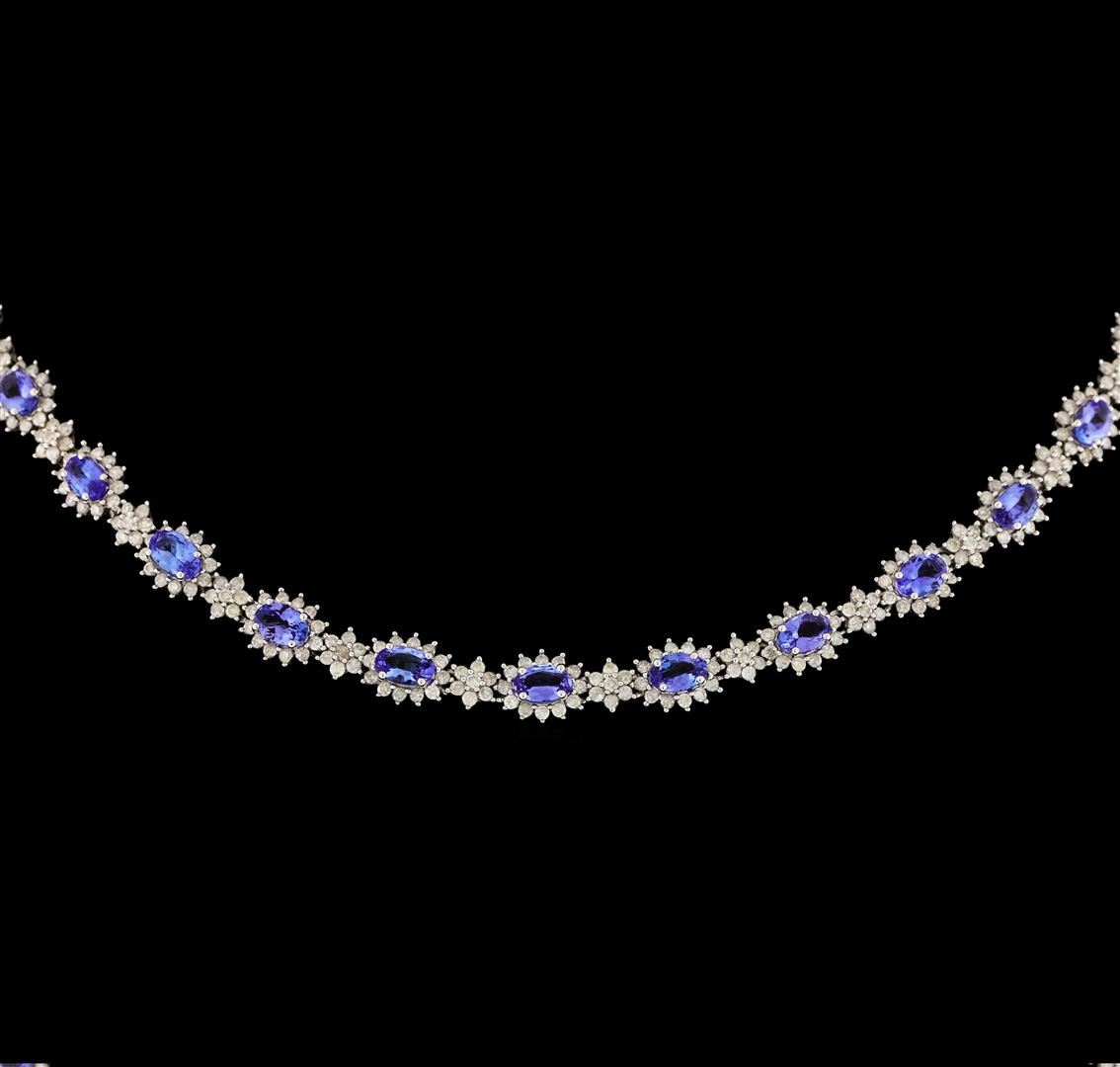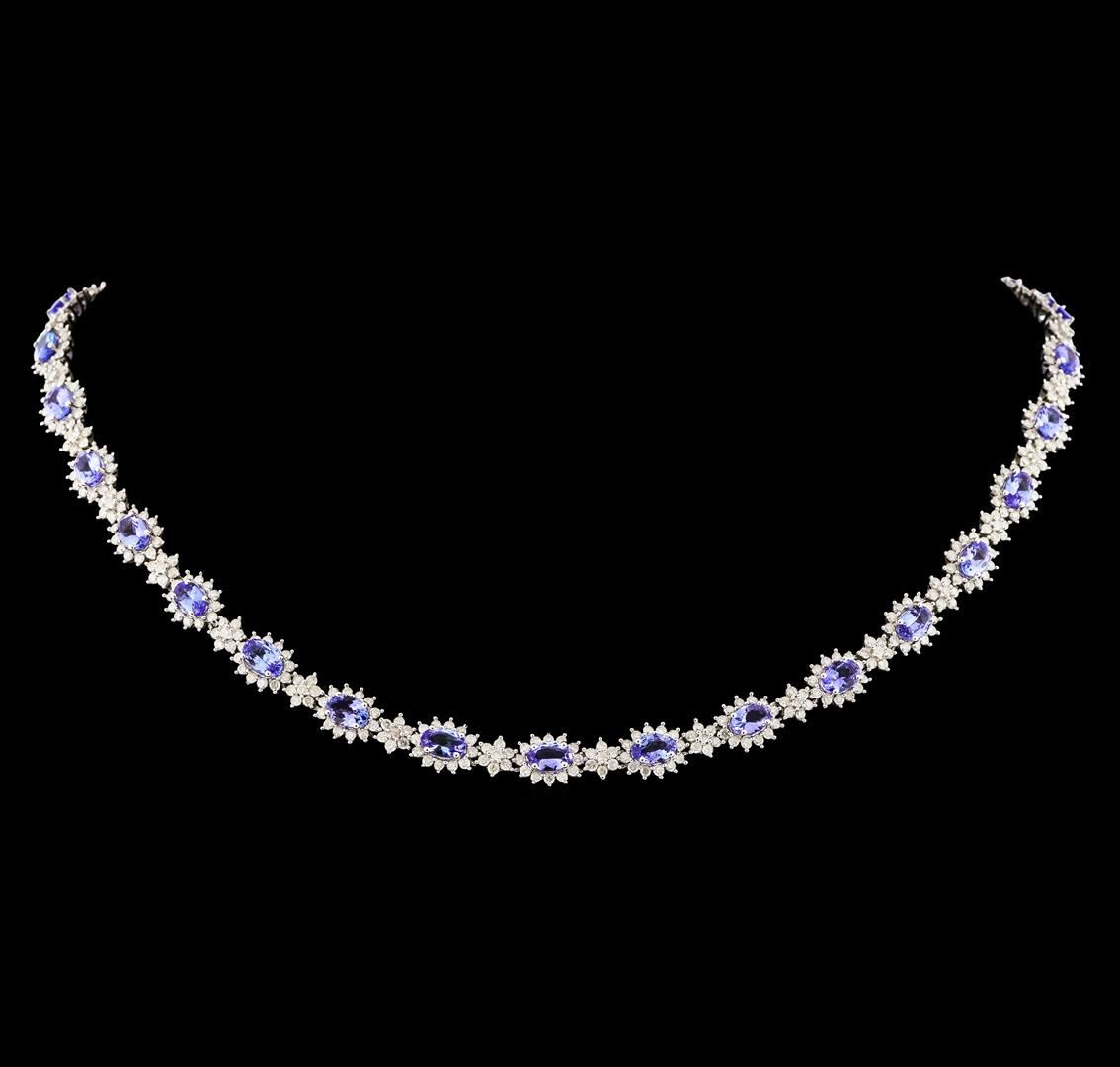 One electronically tested 14KT white gold ladies cast & assembled tanzanite and diamond necklace. Seventeen and one -quarter inch length necklace features a flexible graduation ribbon of tanzanites set within diamond bezels, terminating in a concealed clasp with twin safeties. Bright polish finish. Trademark is Orianne. Identified with markings of "14K". Condition is new, good workmanship. Containing: Forty-four prong set oval mixed cut natural tanzanites approximate total weight of 18.69ct., clarity is eye clean, type I, medium, slightly grayish, bluish violet color, (GIA bV 5/2), cut is good. Transmitting light with no distortion, transparent. Color grade is an average for the group. Graded in the setting. Tanzanite is a very rare gemstone that is only found in the country of Tanzania. Originally discovered in 1967. Tiffany & Company, named the stone Tanzanite. It is found in the Usumburu Mountains that border the Umba Valley of northern Tanzania. Tanzanite occurs in gray, brown, violet, blue, reddish-purple, & green. The gem is interesting because of its exceptional pleochroism. Rotated in different directions a tanzanite will exhibit multiple changes of color. Tanzanite has a low tolerance to ultrasonic cleaning, and should not be cleaned using this method. One Thousand, Sixty prong set round brilliant cut diamonds approximate total weight of 1060 Stones = 2.66ct. The color grade reflects the entire range of color for this group. Graded in the setting. Clarity: I-1 to I-3. Color: G - J. Total Weight of Colored Stones 18.69ct. Total Weight of Diamonds 2.66ct. Total Weight of Necklace 28.85gm. AIG Appraised at $27,805.00.