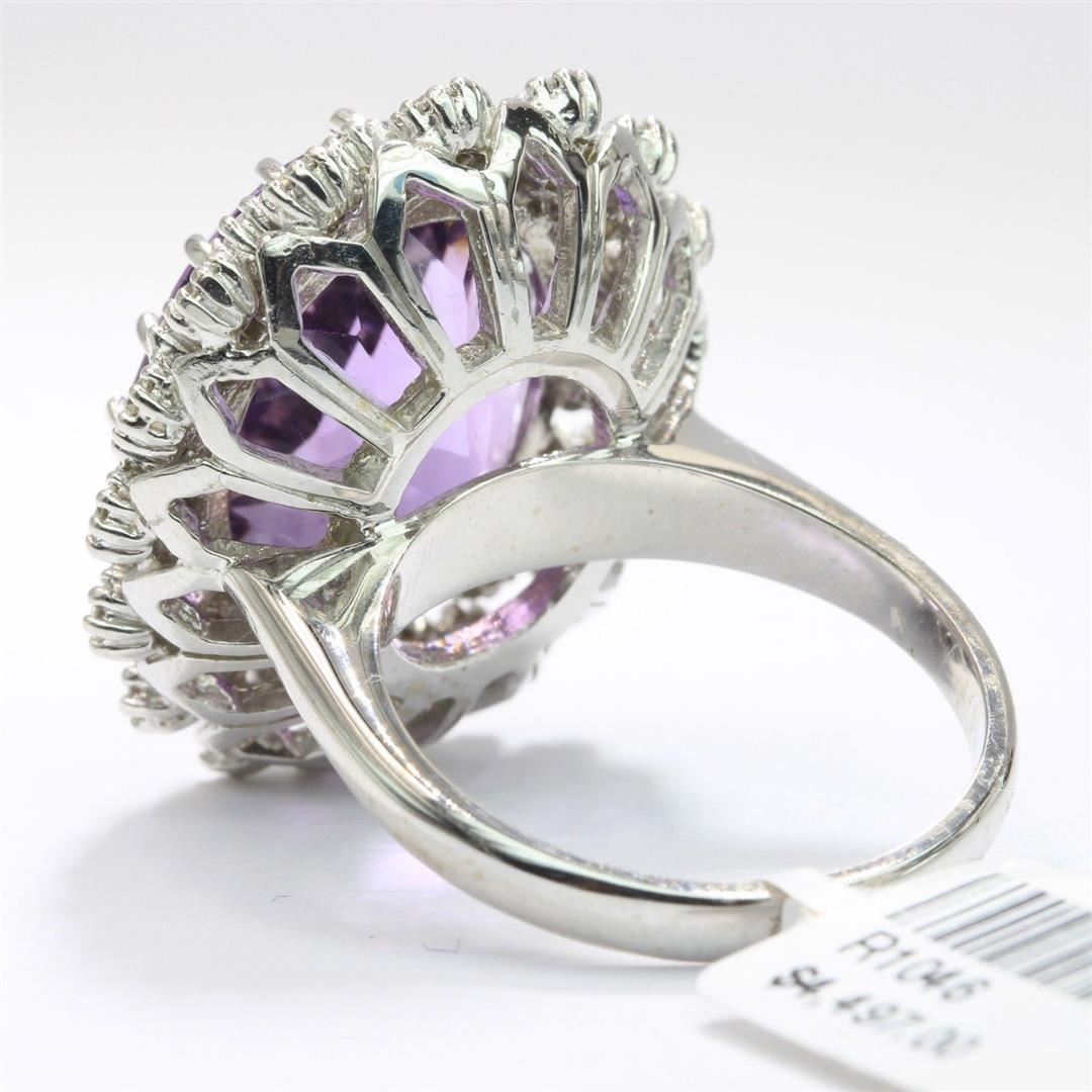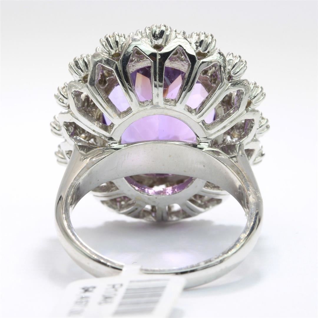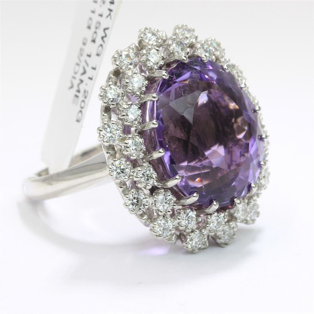 One Oval Cut Natural Amethyst Diamond Woman's Band Ring in 14k White Gold. Total carat weight is 13.26 Ct. Ring is size 6.5 but resizable. Setting style is 4 prong with accent diamonds. Gross gold is 11.20 grams. Total stone is 33 diamonds. Condition is brand new. Main stone is natural and non-enhanced. Main stone is 12.15 Carats, oval brilliant cut, good clarity, purple color, and excellent cut. Main stone approximate size is 16.00 x 13.60 MM. Side stone is natural and non-enhanced. Side diamonds total carats is 1.11 Ct. Side diamonds shape is round brilliant cut, clarity SI, color G, and cut is excellent. Number of side diamonds is 32 diamonds.