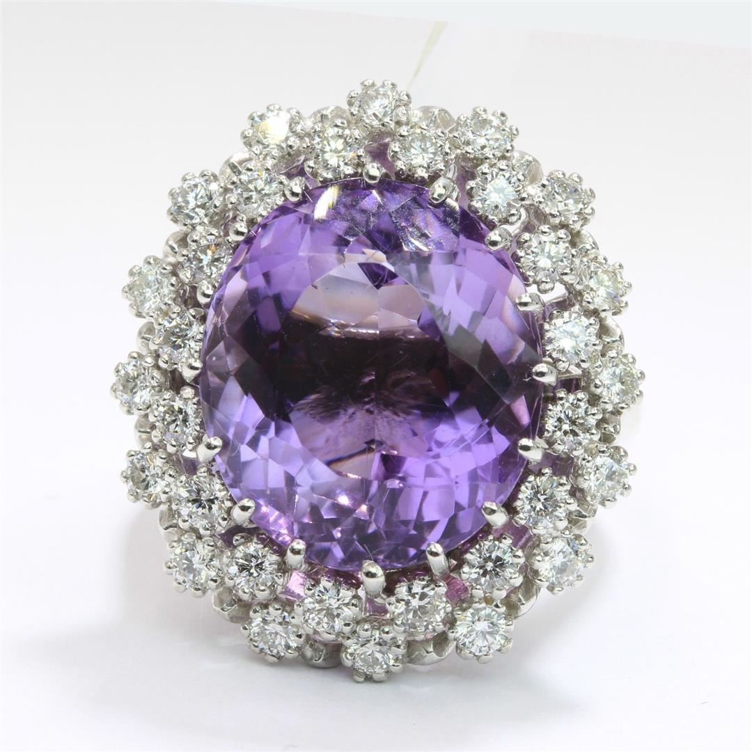 One Oval Cut Natural Amethyst Diamond Woman's Band Ring in 14k White Gold. Total carat weight is 13.26 Ct. Ring is size 6.5 but resizable. Setting style is 4 prong with accent diamonds. Gross gold is 11.20 grams. Total stone is 33 diamonds. Condition is brand new. Main stone is natural and non-enhanced. Main stone is 12.15 Carats, oval brilliant cut, good clarity, purple color, and excellent cut. Main stone approximate size is 16.00 x 13.60 MM. Side stone is natural and non-enhanced. Side diamonds total carats is 1.11 Ct. Side diamonds shape is round brilliant cut, clarity SI, color G, and cut is excellent. Number of side diamonds is 32 diamonds.