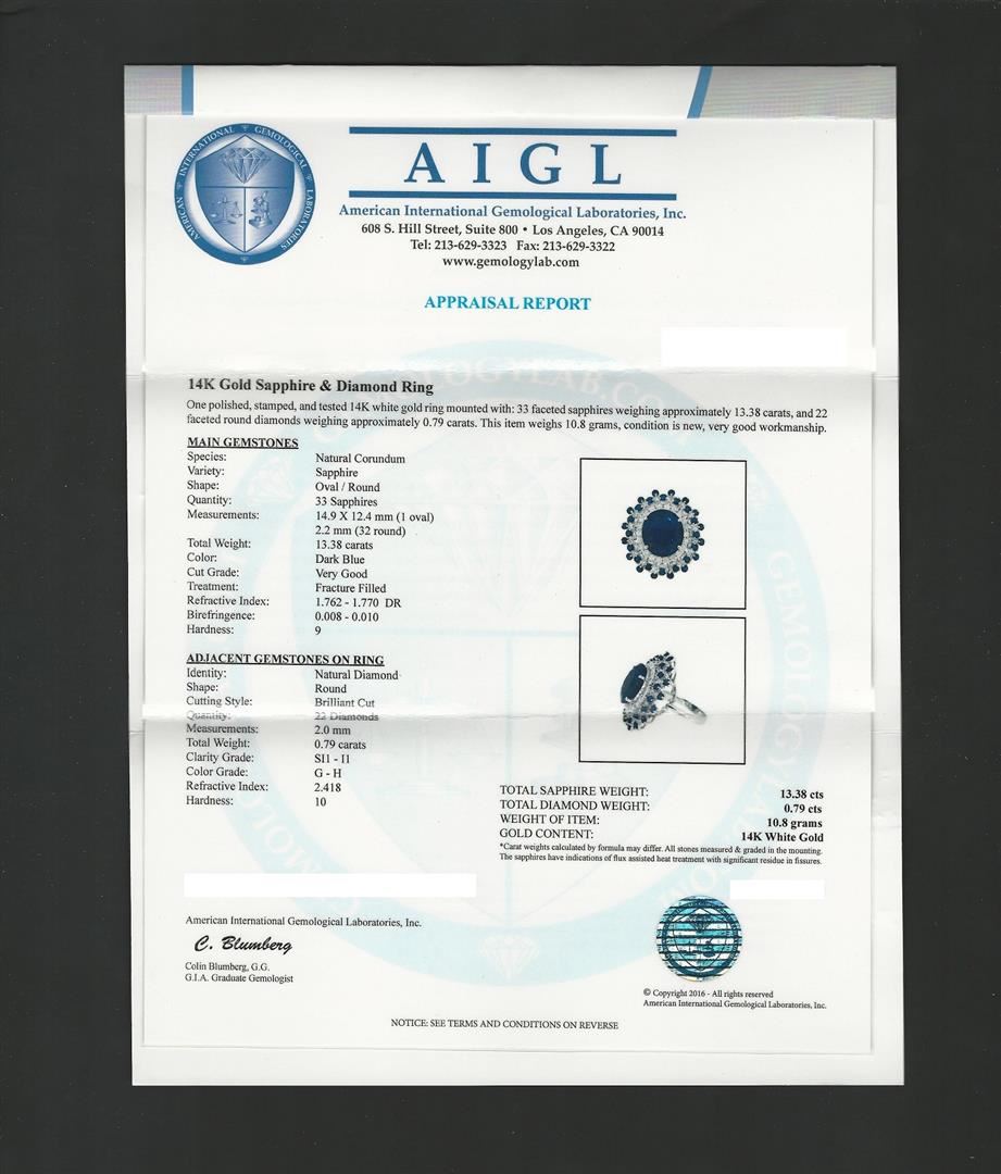 One polished, stamped, and tested 14K white gold ring mounted with: 33 faceted sapphires weighing approximately 13.38 carats, and 22 faceted round diamonds weighing approximately 0.79 carats. This item weighs 10.8 grams, condition is new, very good workmanship. AIGL Appraised.