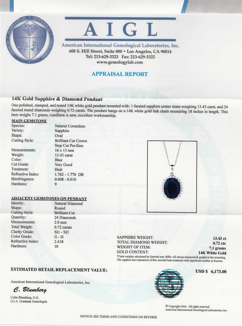 One polished, stamped, and tested 14K white gold pendant mounted with: 1 faceted sapphire center stone weighing 13.43 carat, and 24 faceted round diamonds weighing 0.72 carats. The pendant hangs on a 14K white gold link chain measuring 18 inches in length. This item weighs 7.1 grams, condition is new, excellent workmanship. 24 diamonds with a clarity of (SI1-SI3) and a color of (G-H). AIG Appraised at $6,173.00.
