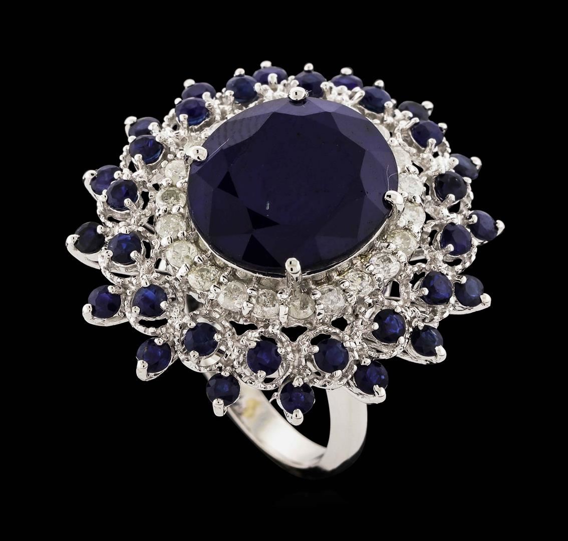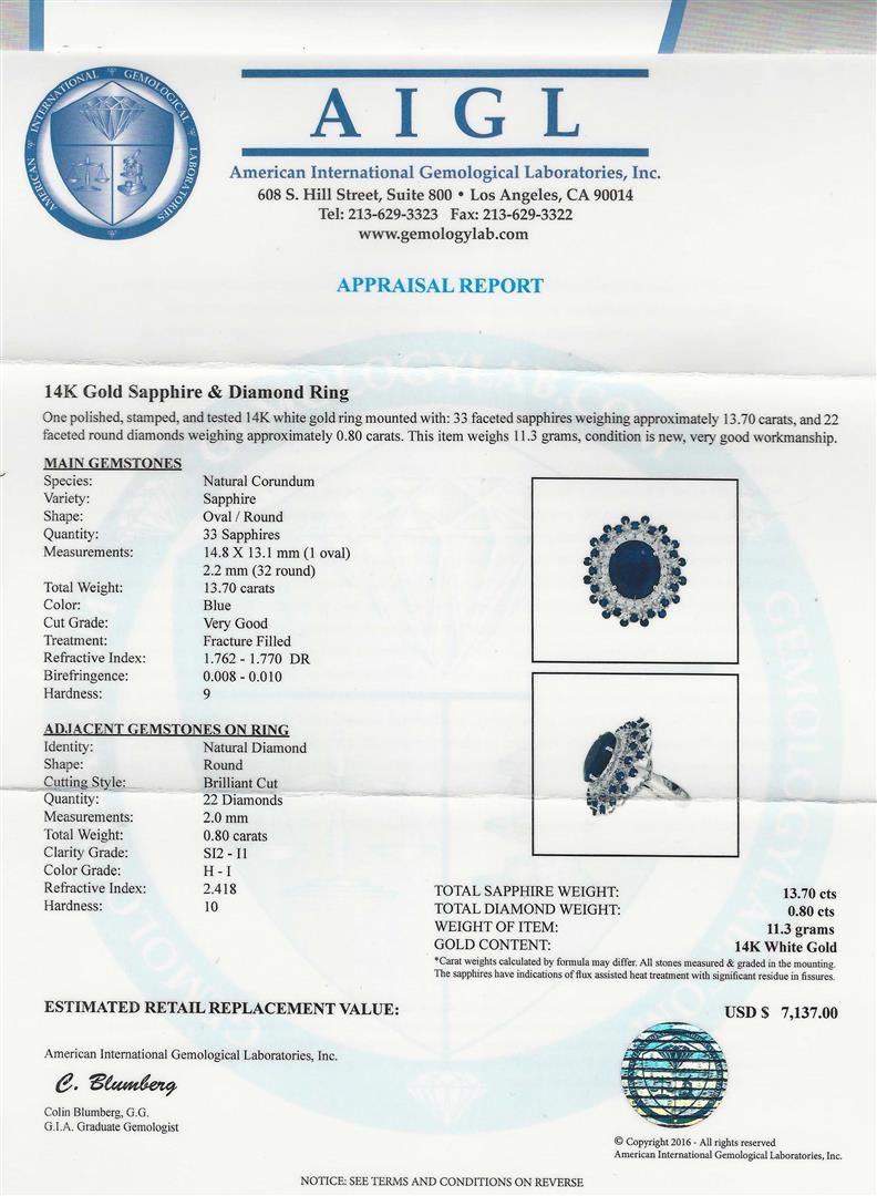One polished, stamped, and tested 14K white gold ring mounted with: 33 faceted sapphires weighing approximately 13.70 carats, and 22 faceted round diamonds weighing approximately 0.80 carats. This item weighs I I.3 grams, condition is new, very good workm AIGL Appraised at $7,137.00.