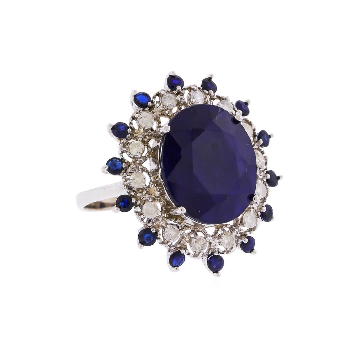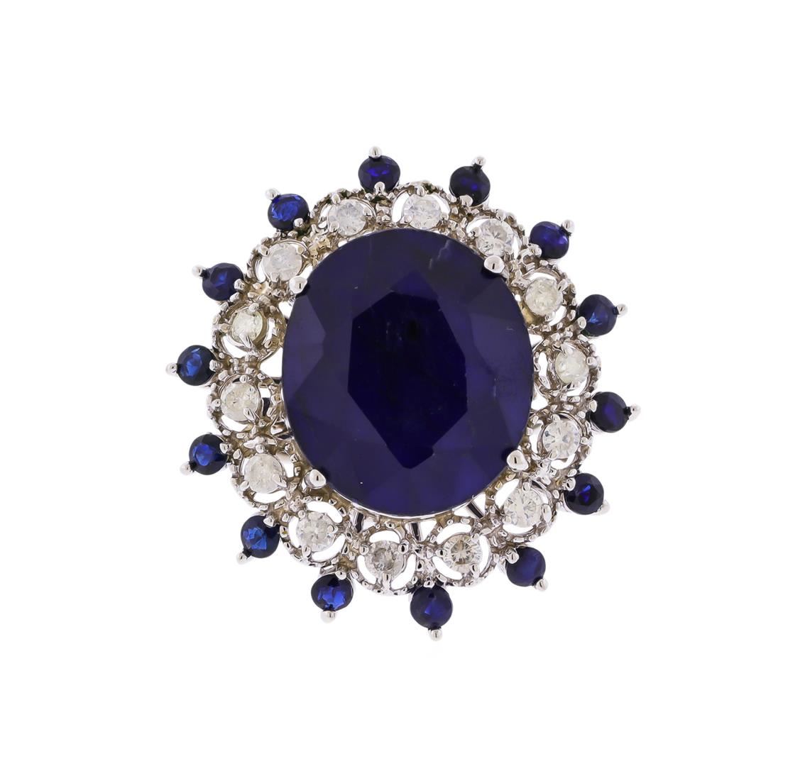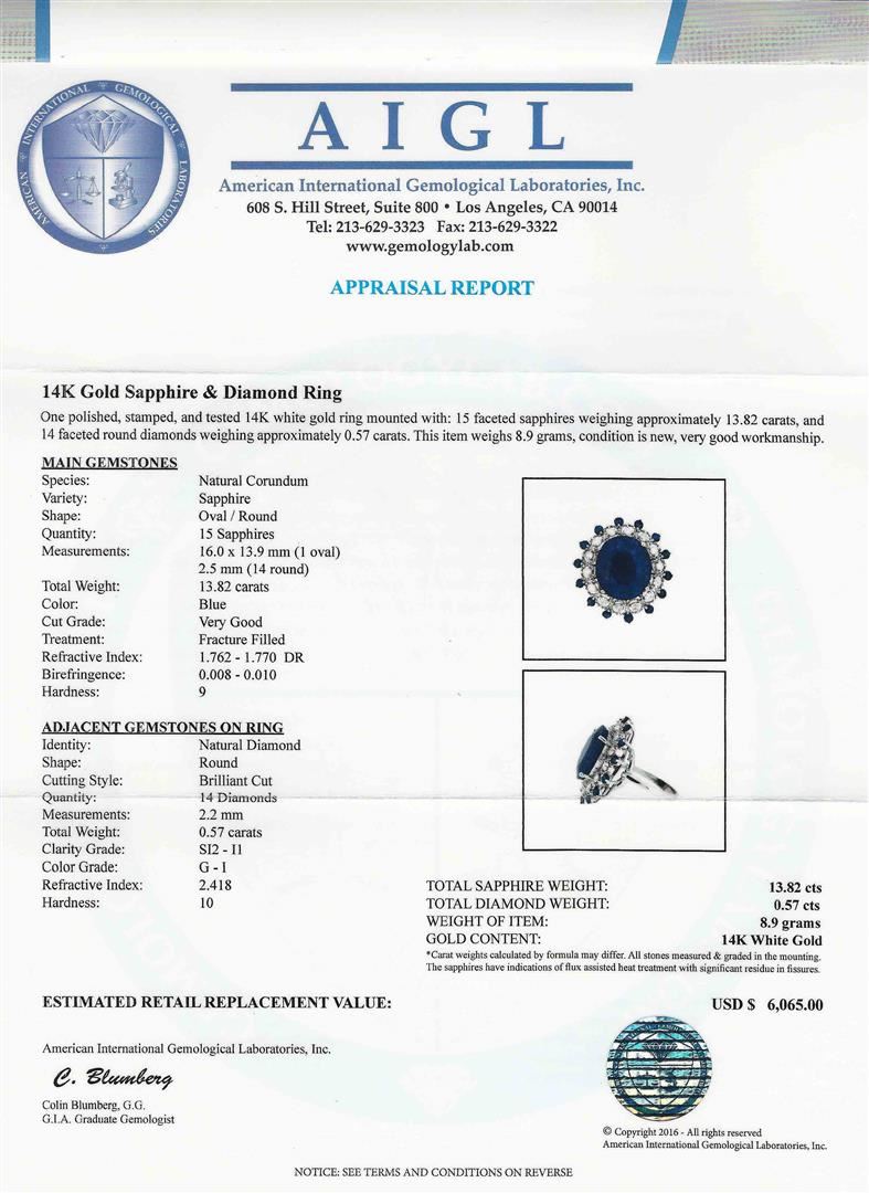 One polished, stamped and tested 14K white gold Natural Corundum Blue Sapphire and Diamond Ring. This beautiful ring is mounted with: 15 faceted blue sapphires weighing approximately 13.82 carats, and 14 brilliant cut round diamonds, average clarity SI2-I1, average color G-I, weighing approximately 0.57 carats. This item weighs 8.9 grams, condition is new, very good workmanship. AIGL Appraised at $6,065.00.