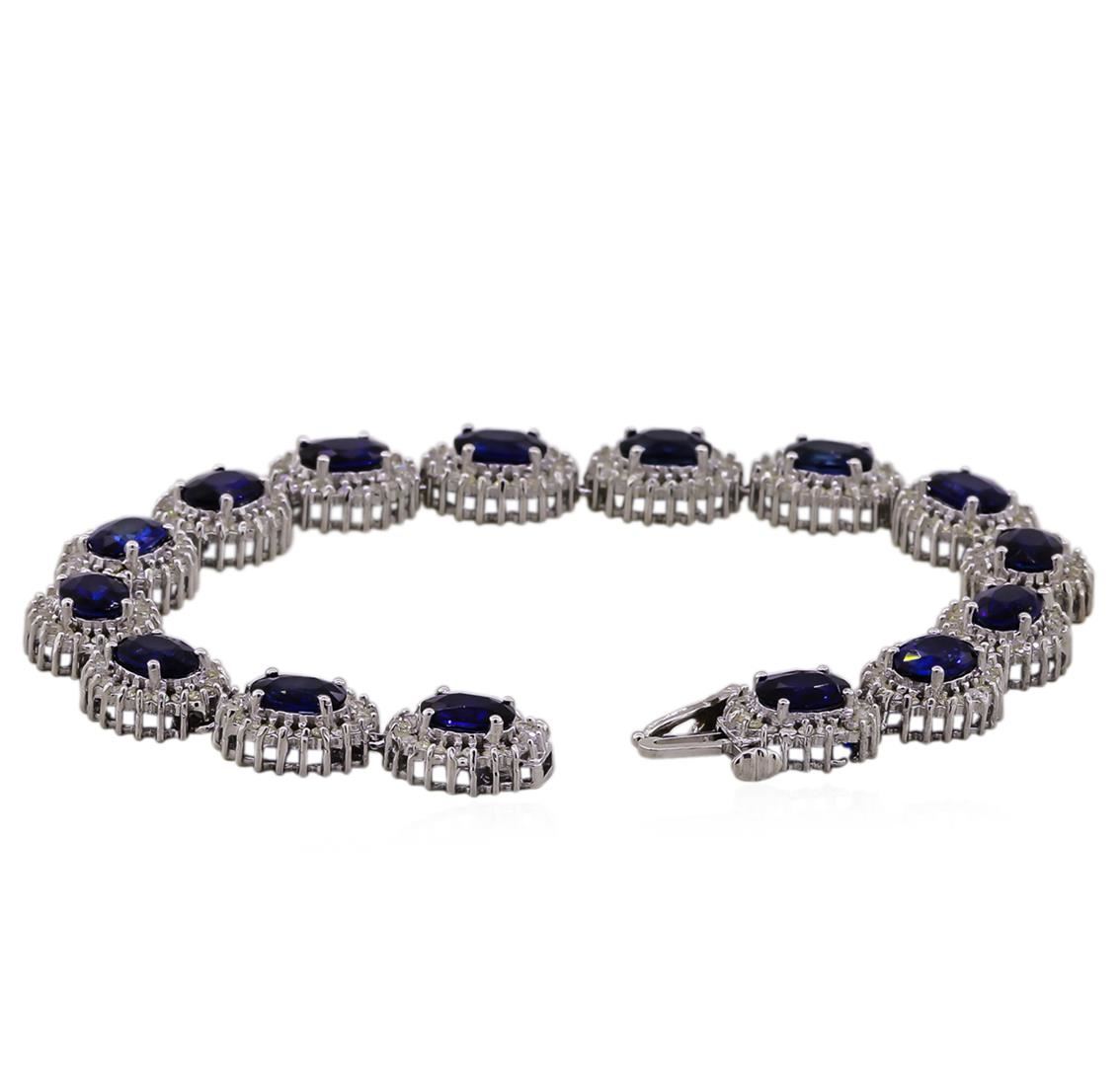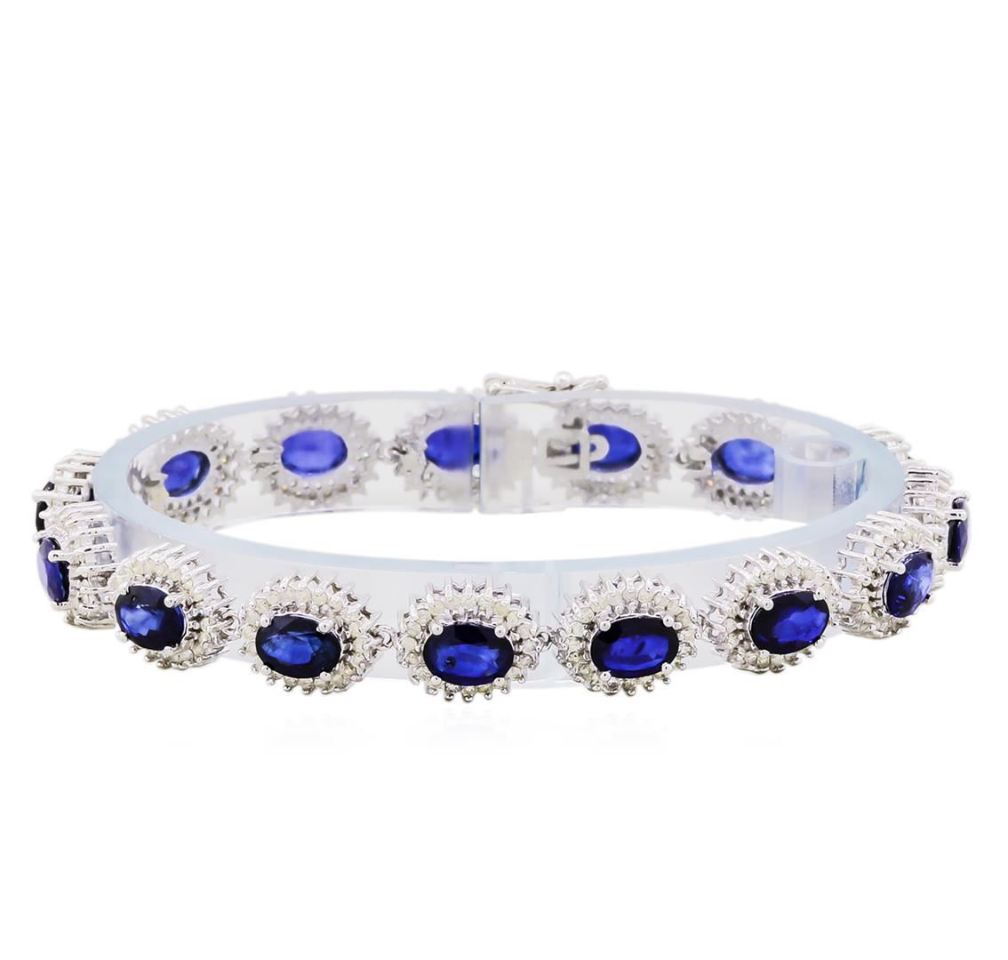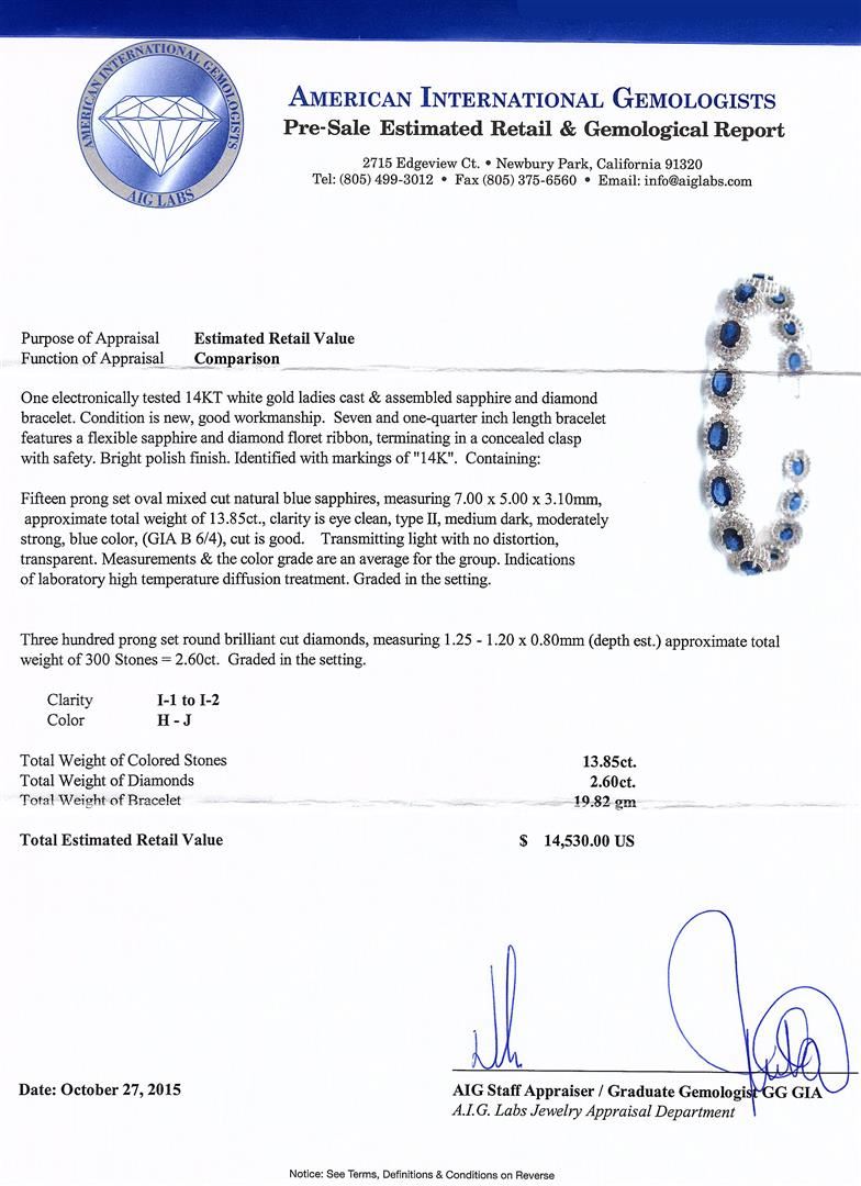 One electronically tested 14KT white gold ladies cast & assembled sapphire and diamond bracelet. Seven and one-quarter inch length bracelet features a flexible sapphire and diamond floret ribbon, terminating in a concealed clasp with safety. Bright polish finish. Identified with markings of "14K". Condition is new, good workmanship. Containing: Fifteen prong set oval mixed cut natural blue sapphires, measuring 7.00 x 5.00 x 3.10mm, approximate. Total Weight of 13.85ct., clarity is eye clean, type II, medium dark, moderately strong, blue color, (GIA B 6/4), cut is good. Transmitting light with no distortion, transparent. Measurements & the color grade are an average for the group. Indications of laboratory high temperature diffusion treatment. Graded in the setting.Three Hundred prong set round brilliant cut diamonds, measuring 1.25 - 1.20 x 0.80mm (depth est.) approximate. Total Weight of 300 Stones = 2.60ct. Graded in the setting. Clarity: I-1 to I-2. Color: H - J. Total Weight of Colored Stones 13.85ct. Total Weight of Diamonds 2.60ct. Total Weight of Bracelet 19.82gm. AIG Appraised at $14,530.00.