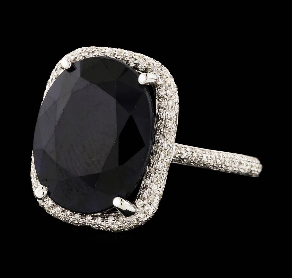 One electronically tested 14KT white gold ladies cast sapphire and diamond ring with a bright polish finish. The featured sapphire is set within a diamond bezel supported by diamond set shoulders, completed by a two millimeter wide band. Trademark is Orianne. Identified with markings of "14K". Condition is new, good workmanship. Containing: One prong set oval mixed cut natural blue sapphire, measuring 15.80 x 12.70 x 8.00mm, approximate weight of 13.93ct., type II, dark, moderately strong, blue color, (GIA B 7/4), cut is good. Transmitting light very diffusely, opaque. Naturally occurring internal & external characteristics are present. Indications of laboratory high temperature diffusion treatment. Graded in the setting. Two Hundred Forty-Six prong set round brilliant cut diamonds approximate total weight of 246 Stones = 0.50ct. Graded in the setting. Clarity: I-1 to I-2. Color: G - I. Total Weight of Colored Stones 13.93ct. Total Weight of Diamonds 0.50ct. Total Weight of Ring 7.57gm. AIG Appraised at $5,360.00.
