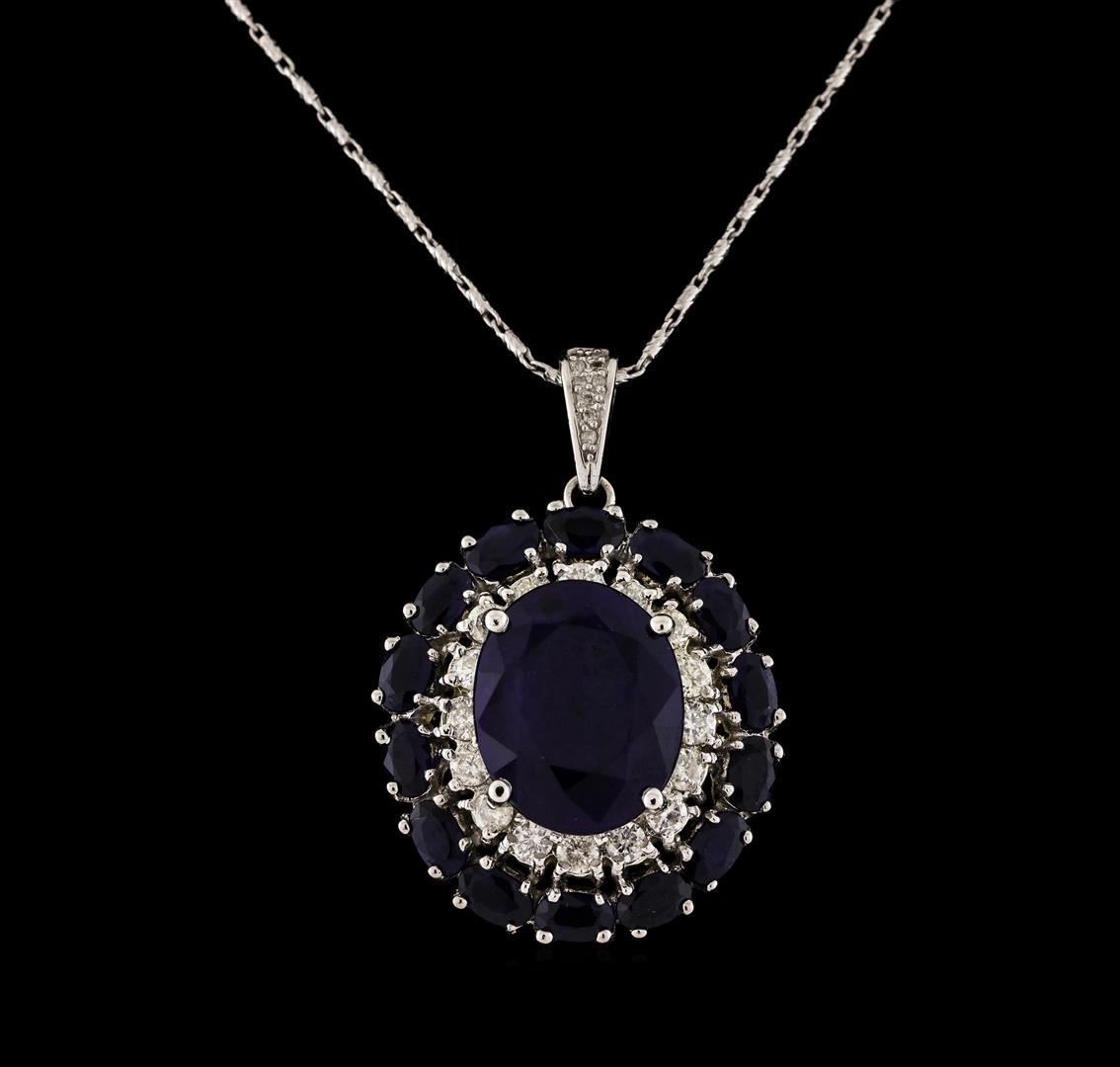 One polished, stamped, and tested 14K white gold pendant mounted with: 15 faceted sapphires weighing 15.88 carats, and 25 faceted round diamonds weighing 1.10 carats. The pendant hangs on a 14K white gold link chain measuring 18 inches in length. This item weighs 15.0 grams, condition is new, excellent workmanship. 25 diamonds with a clarity of (SI1-SI3) and color of (H-I). AIGL Appraised.