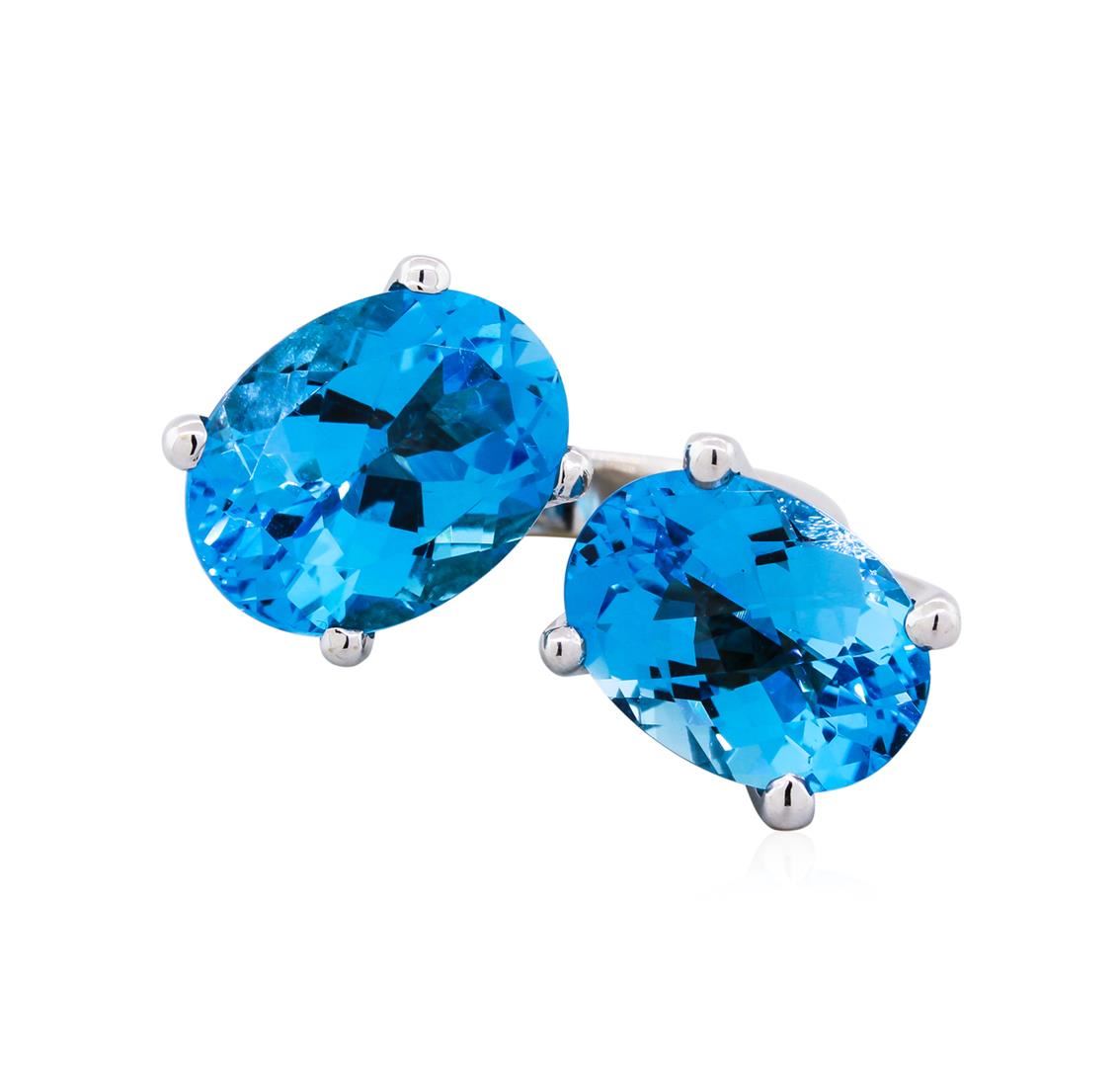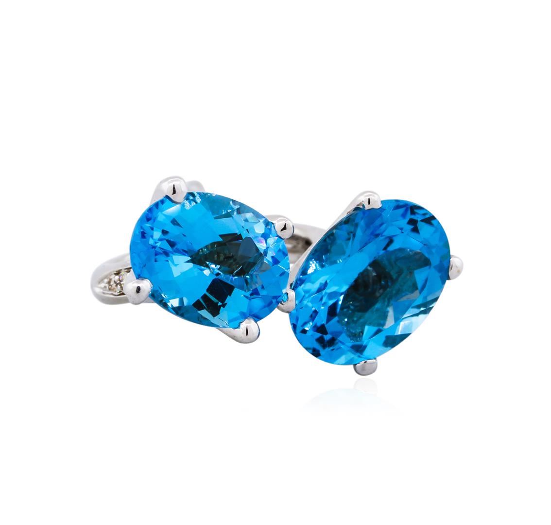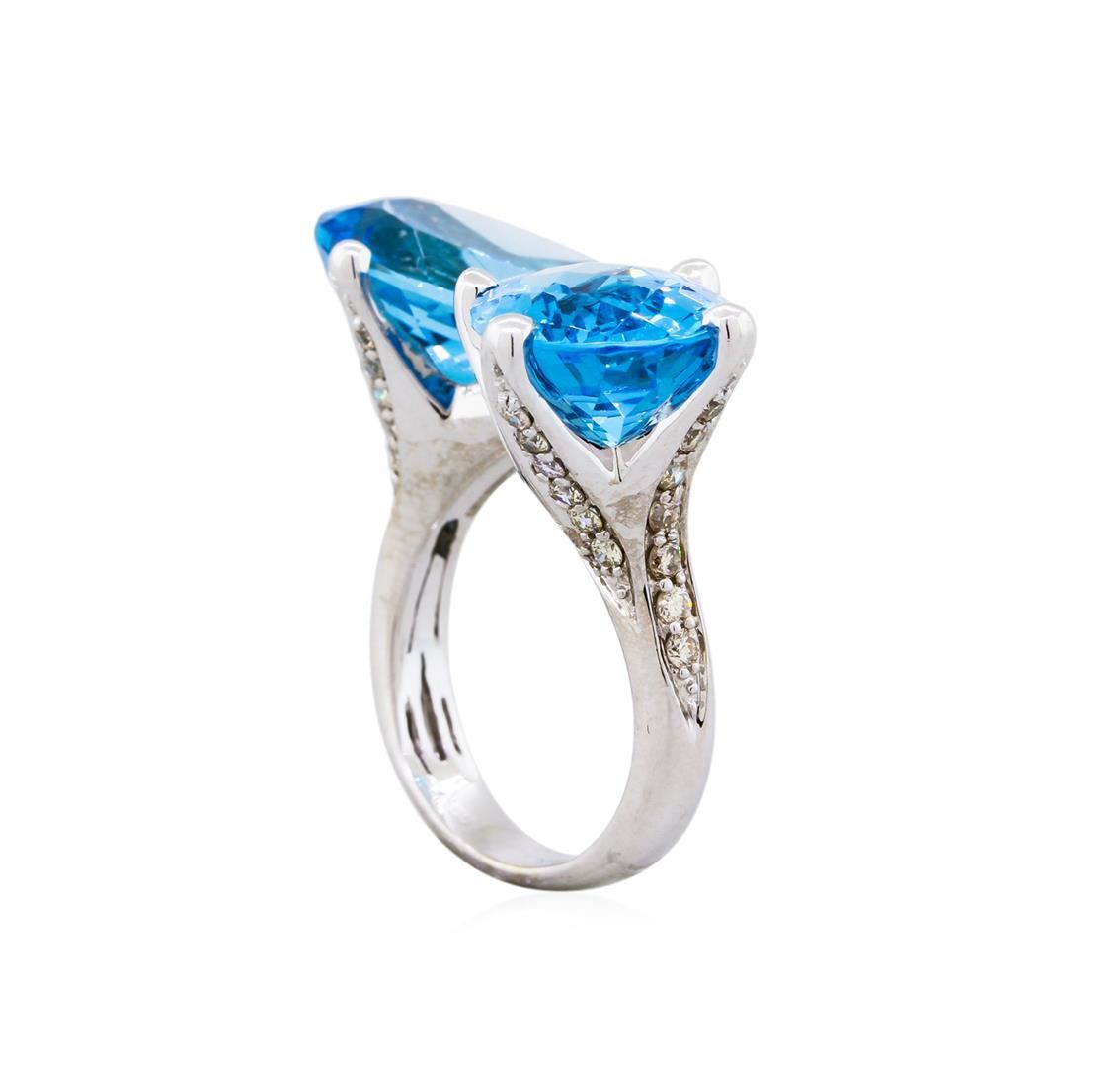 This beautiful and unique ring features two blue topaz gemstones totalling 17.21 caratsand fourty-six round diamonds totalling 0.75 carats set in 8.42 grams of 14KT white gold.