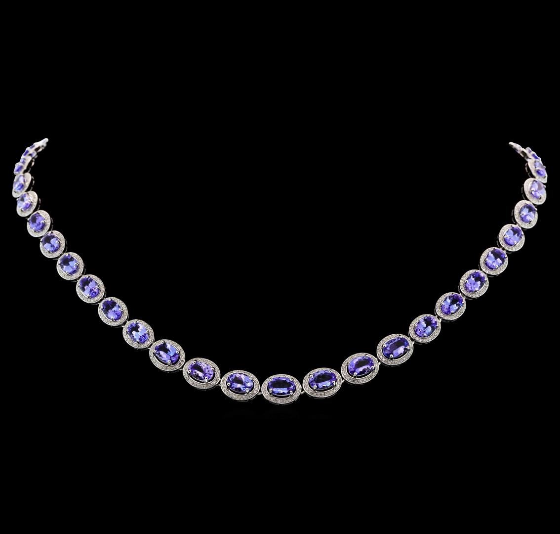 One electronically tested 14KT white gold ladies cast & assembled tanzanite and diamond necklace. Seventeen and one-quarter inch length necklace features a flexible graduating tanzanite and diamond ribbon, terminating in a concealed clasp with twin safeties. Bright polish finish with milgrain detailing. Trademark is Orianne. Identified with markings of "14K". Condition is new, good workmanship. Containing: Forty-four prong set oval mixed cut natural tanzanites approximate total weight of 19.85ct., clarity is eye clean, type I, medium dark, very slightly grayish, bluish violet color, (GIA bV 6/3), cut is good. Transmitting light with no distortion,transparent. Color grade is an average for the group. Graded in the setting.Tanzanite is a very rare gemstone that is only found in the country of Tanzania. Originally discovered in 1967. Tiffany & Company, named the stone Tanzanite. It is found in the Usumburu Mountains that border the Umba Valley of northern Tanzania. Tanzanite occurs in gray, brown, violet, blue, reddish-purple, & green. The gem is interesting because of its exceptional pleochroism. Rotated in different directions a tanzanite will exhibit multiple changes of color. Tanzanite has a low tolerance to ultrasonic cleaning, and should not be cleaned using this method.One Thousand, Forty prong set round brilliant cut diamonds approximate total weight of 1040 Stones = 2.81ct. Graded in the setting. Clarity: I-1 to I-2. Color: G - I. Total Weight of Colored Stones 19.85ct. Total Weight of Diamonds 2.81ct. Total Weight of Necklace 27.72gm. AIG Appraised.