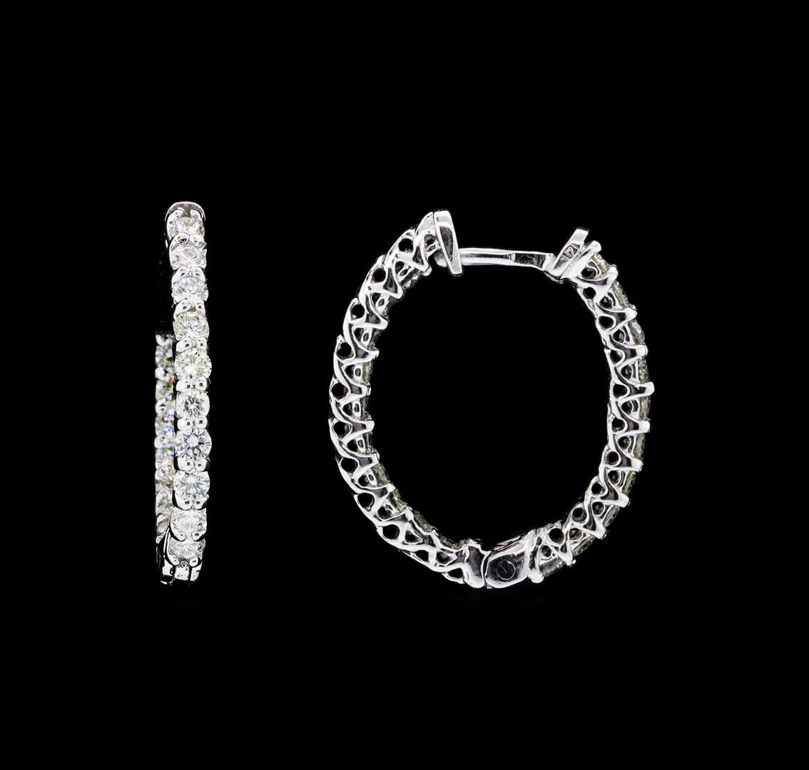 One pair electronically tested 14KT white gold lady's combination cast & assembled inside out hoop earrings with hinged clip backs with a bright polish finish. Identified with markings of "14K". Condition is new, good workmanship. Containing: Forty prong set round brilliant cut diamonds, measuring 2.50 - 2.40 x 1.47mm (depth est.) approximate total weight of 40 Stones = 2.00ct. Graded in the setting. Color H - I Clarity SI-1 to I-1 Cut Good. Total Weight of Diamonds 2.00ct. Total Weight of Earrings 6.20gm. GAS Appraised.