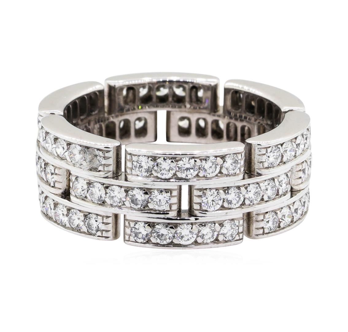 One electronically tested 14KT white gold Ladies combination cast & assembled fashion ring with a bright polish finish. The featured Ladies ring has a three row link motif and a shank measuring 7.97 millimeters wide. Identified with markings of '14K'. Condition is new, good workmanship. Containing: Ninety prong set round brilliant cut diamonds, measuring 1.80 - 1.75 x 1.10mm (depth est.) approximate total weight of 90 Stones = 2.00ct. Graded in the setting. Color G - I Clarity VS-1 to VS-2 Cut Excellent. Total Weight of Diamonds 2.00ct.. Total Weight of Ring 10.30gm. GAS Appraised.