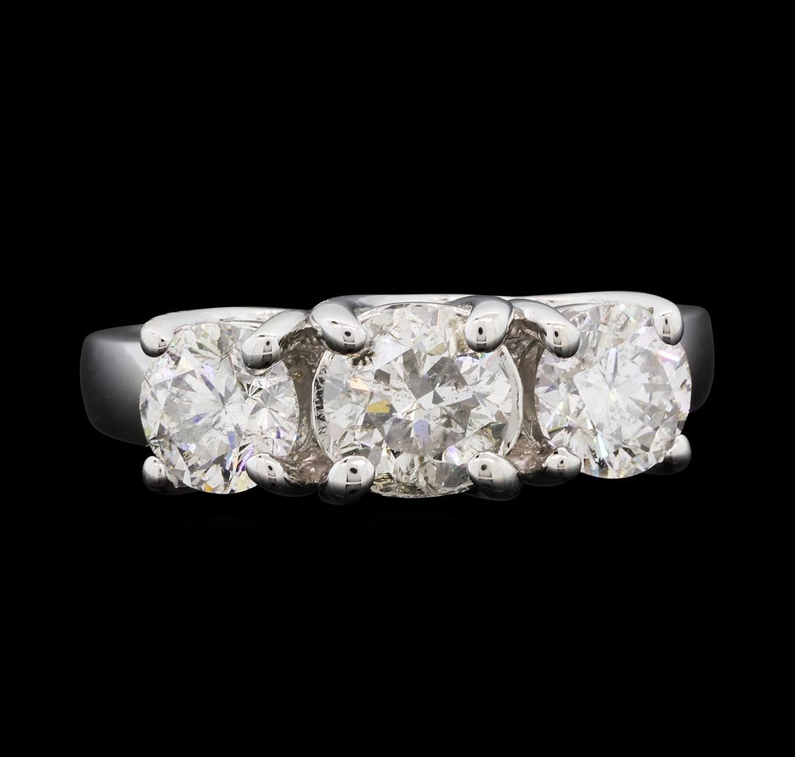 One electronically tested 14KT white gold lady's cast three stone wedding ring with a tapered shank with a bright polish finish. The featured lady's ring has a scalloped under gallery and a shank measuring 1.90 millimeters wide. Identified with markings of "14K". Condition is new, good workmanship. Containing: One prong set round brilliant cut diamond, measuring 5.85 - 5.80 x 3.81mm (depth est.) , 5.00.%. GTCF approximate weight of 0.83ct. Graded in the setting. Color I Clarity I-1 Cut Good Two prong set round brilliant cut diamonds, measuring 5.45 - 5.35 x 3.36mm (depth est.) approximate. Total Weight of 2 Stones = 1.17ct. Graded in the setting. Color H - I Clarity I-1 Cut Good. Total Weight of Diamonds 2.00ct.. Total Weight of Ring 6.20gm. GAS Appraised.