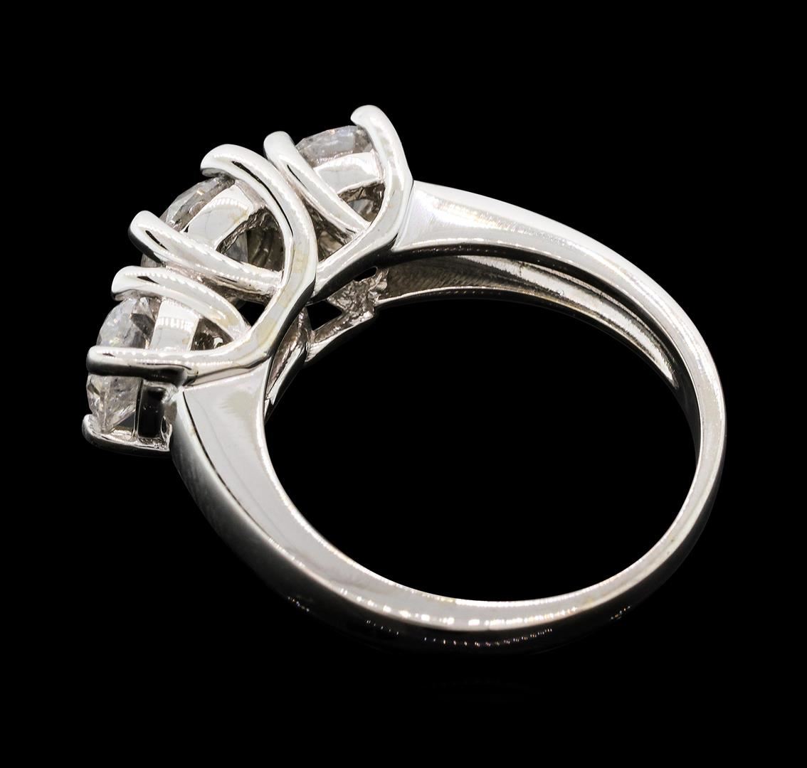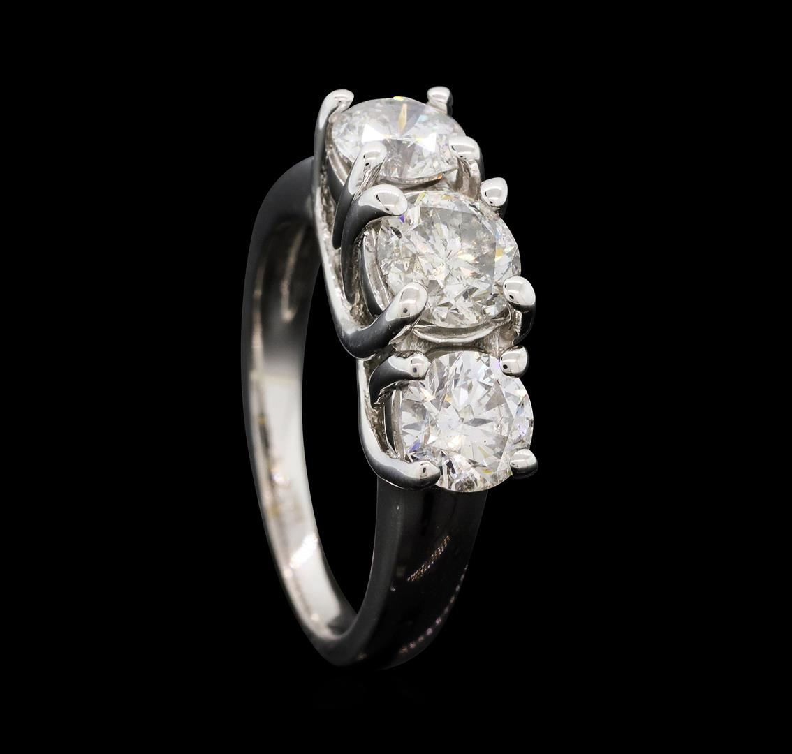 One electronically tested 14KT white gold lady's cast three stone wedding ring with a tapered shank with a bright polish finish. The featured lady's ring has a scalloped under gallery and a shank measuring 1.90 millimeters wide. Identified with markings of "14K". Condition is new, good workmanship. Containing: One prong set round brilliant cut diamond, measuring 5.85 - 5.80 x 3.81mm (depth est.) , 5.00.%. GTCF approximate weight of 0.83ct. Graded in the setting. Color I Clarity I-1 Cut Good Two prong set round brilliant cut diamonds, measuring 5.45 - 5.35 x 3.36mm (depth est.) approximate. Total Weight of 2 Stones = 1.17ct. Graded in the setting. Color H - I Clarity I-1 Cut Good. Total Weight of Diamonds 2.00ct.. Total Weight of Ring 6.20gm. GAS Appraised.