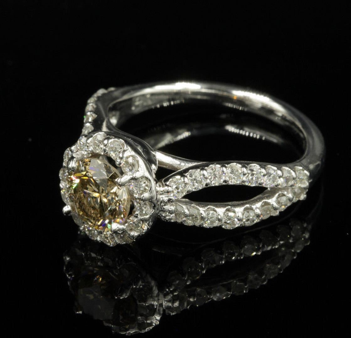 One Natural Round Cut Diamond Engagement Wedding Ring in 14k White Gold. Total carat weight is 2.03 carats. Gross weight is 4.95 grams with a total of 47 diamonds. Condition is brand new. Size is 6.50 but can be resized free of charge. Main stone is non-enhanced and natural. Main diamond carat is 1.04 carats, shape brilliant round cut, clarity SI-2, color natural fancy brown / cognac, and cut is excellent. Side diamond is non-enhanced / natural with a total of 0.99 carats. Side diamond shape is brilliant round cut, clarity SI, color G-H, cut excellent, with a total of 46 diamonds.