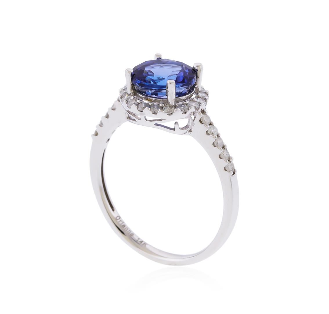 One electronically tested 14KT white gold ladies cast tanzanite and diamond ring with a bright polish finish. The featured tanzanite is set within a diamond bezel supported by diamond set shoulders, completed by a one and one-half millimeter wide band. Trademark is Orianne. Identified with markings of "14K". Condition is new, good workmanship. Containing: One prong set round brilliant cut natural tanzanite, measuring 7.48 - 7.45 x 4.82 mm, 8%. bulge factor, approximate weight of 2.04ct., clarity is eye clean, type I, dark, very slightly grayish, violetish blue color, (GIA vB 7/3), cut is good. Natural Tanzanite, color enhanced due to cobalt coating. The presence of the coating prevents determining the stone's actual depth of color. Transmitting light with no distortion, transparent. Grading in the setting. The cobalt coated Tanzanite has a low tolerance to ultrasonic cleaning, and should not be cleaned using this method. Tanzanite is a very rare gemstone that is only found in the country of Tanzania. Originally discovered in 1967. Tiffany & Company, named the stone Tanzanite. It is found in the Usumburu Mountains that border the Umba Valley of northern Tanzania. Tanzanite occurs in gray, brown, violet, blue, reddish-purple, & green. The gem is interesting because of its exceptional pleochroism. Rotated in different directions a tanzanite will exhibit multiple changes of color.Twenty-Eight prong set round brilliant cut diamonds, measuring 1.50 - 1.40 x 0.87mm (depth est.) approximate total weight of 28 Stones = 0.35ct. Graded in the setting. Clarity: I-1 to I-3. Color: H - J. Total Weight of Colored Stones 2.04ct. Total Weight of Diamonds 0.35ct. AIG Appraised at $2,290.00.
