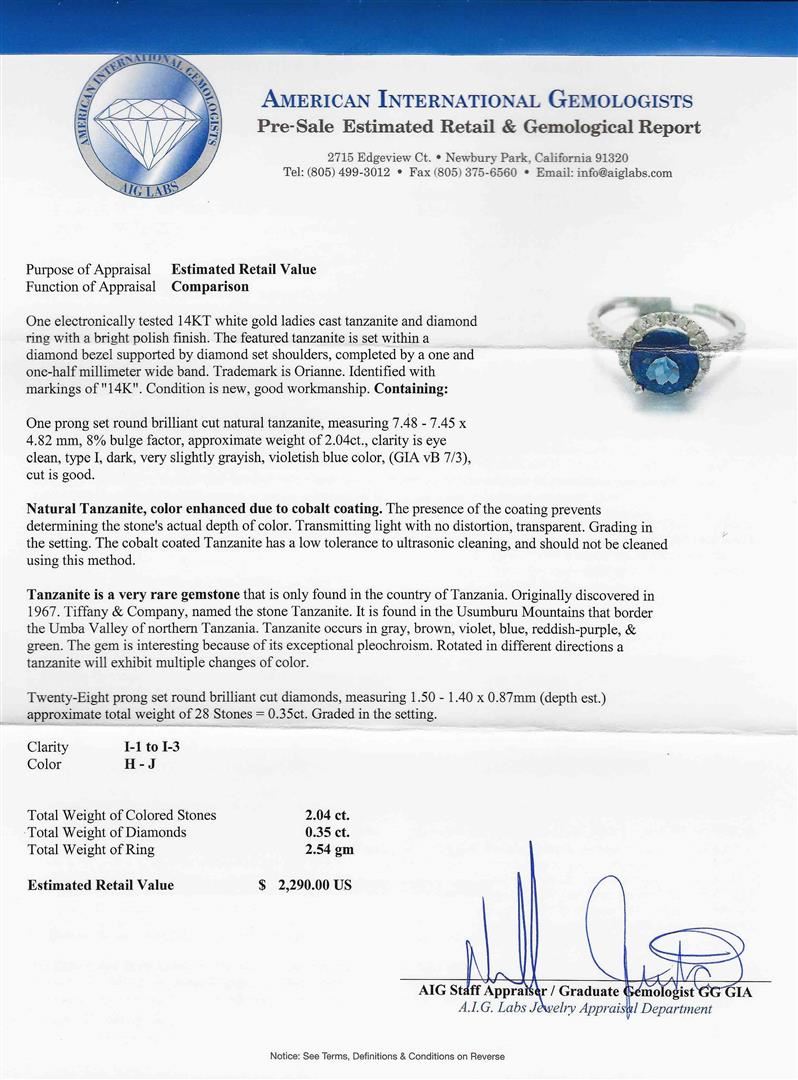 One electronically tested 14KT white gold ladies cast tanzanite and diamond ring with a bright polish finish. The featured tanzanite is set within a diamond bezel supported by diamond set shoulders, completed by a one and one-half millimeter wide band. Trademark is Orianne. Identified with markings of "14K". Condition is new, good workmanship. Containing: One prong set round brilliant cut natural tanzanite, measuring 7.48 - 7.45 x 4.82 mm, 8%. bulge factor, approximate weight of 2.04ct., clarity is eye clean, type I, dark, very slightly grayish, violetish blue color, (GIA vB 7/3), cut is good. Natural Tanzanite, color enhanced due to cobalt coating. The presence of the coating prevents determining the stone's actual depth of color. Transmitting light with no distortion, transparent. Grading in the setting. The cobalt coated Tanzanite has a low tolerance to ultrasonic cleaning, and should not be cleaned using this method. Tanzanite is a very rare gemstone that is only found in the country of Tanzania. Originally discovered in 1967. Tiffany & Company, named the stone Tanzanite. It is found in the Usumburu Mountains that border the Umba Valley of northern Tanzania. Tanzanite occurs in gray, brown, violet, blue, reddish-purple, & green. The gem is interesting because of its exceptional pleochroism. Rotated in different directions a tanzanite will exhibit multiple changes of color.Twenty-Eight prong set round brilliant cut diamonds, measuring 1.50 - 1.40 x 0.87mm (depth est.) approximate total weight of 28 Stones = 0.35ct. Graded in the setting. Clarity: I-1 to I-3. Color: H - J. Total Weight of Colored Stones 2.04ct. Total Weight of Diamonds 0.35ct. AIG Appraised at $2,290.00.