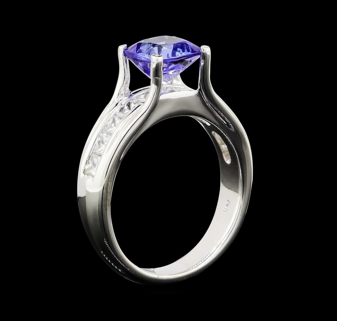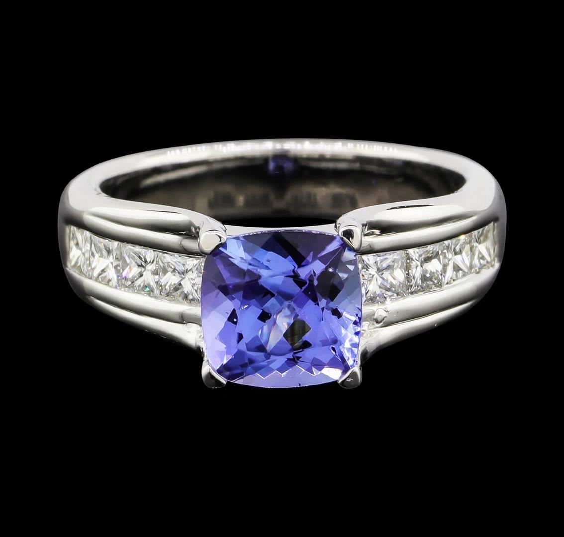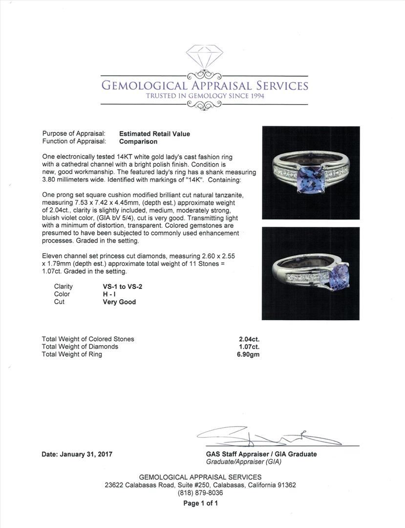 One electronically tested 14KT white gold lady's cast fashion ring with a cathedral channel with a bright polish finish. The featured lady's ring has a shank measuring 3.80 millimeters wide. Identified with markings of "14K". Condition is new, good workmanship. Containing: One prong set square cushion modified brilliant cut natural tanzanite, measuring 7.53 x 7.42 x 4.45mm, (depth est.) approximate weight of 2.04ct., clarity is slightly included, medium, moderately strong, bluish violet color, (GIA bV 5/4), cut is very good. Transmitting light with a minimum of distortion, transparent. Colored gemstones are presumed to have been subjected to commonly used enhancement processes. Graded in the setting.Eleven channel set princess cut diamonds, measuring 2.60 x 2.55 x 1.79mm (depth est.) approximate total weight of 11 Stones = 1.07ct. Graded in the setting. Clarity: VS-1 to VS-2. Color: H - ICut Very Good. Total Weight of Colored Stones 2.04ct. Total Weight of Diamonds 1.07ct. Total Weight of Ring 6.90gm. GAS Appraised.