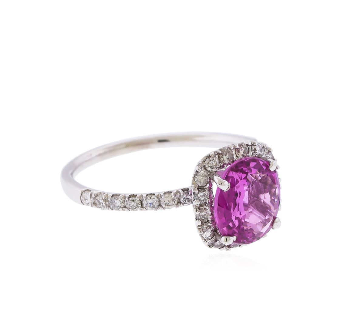 One electronically tested 14KT white gold ladies cast pink sapphire and diamond ring with a bright polish finish. The featured pink sapphire is set within a diamond bezel supported by diamond set shoulders, completed by a one millimeter wide band. Identified with markings of "K14". Condition is new, good workmanship. Containing: One prong set oval modified mixed cut natural pink sapphire, measuring 8.42 x 7.29 x 3.46mm, exact weight 2.07ct. Clarity is eye clean, medium, very slightly grayish, purplish pink color, (GIA pPi 5/3), cut is good. Transmitting light with no distortion, transparent. GIA Gemological Report attached. Graded loose prior to setting in theGIA Laboratory, Report #6177486192.Thirty prong set round brilliant cut diamonds approximate total weight of 30 Stones = 0.43ct. Graded in the setting. Clarity: SI-2 to I-1. Color: H - I. Total Weight of Colored Stones 2.07ct. Total Weight of Diamonds 0.43ct. Total Weight of Ring 2.57gm. AIG Appraised at $10,020.00.
