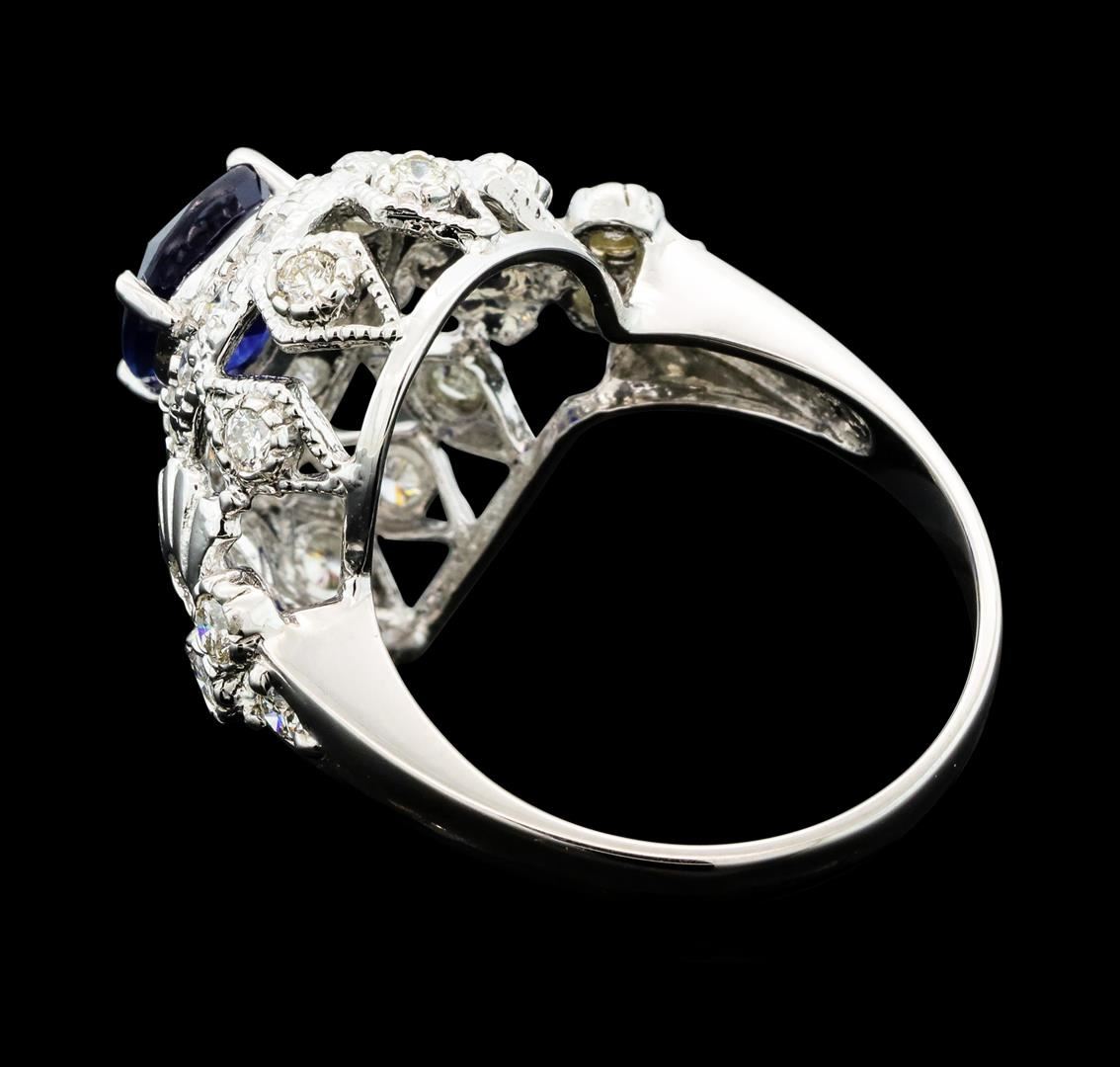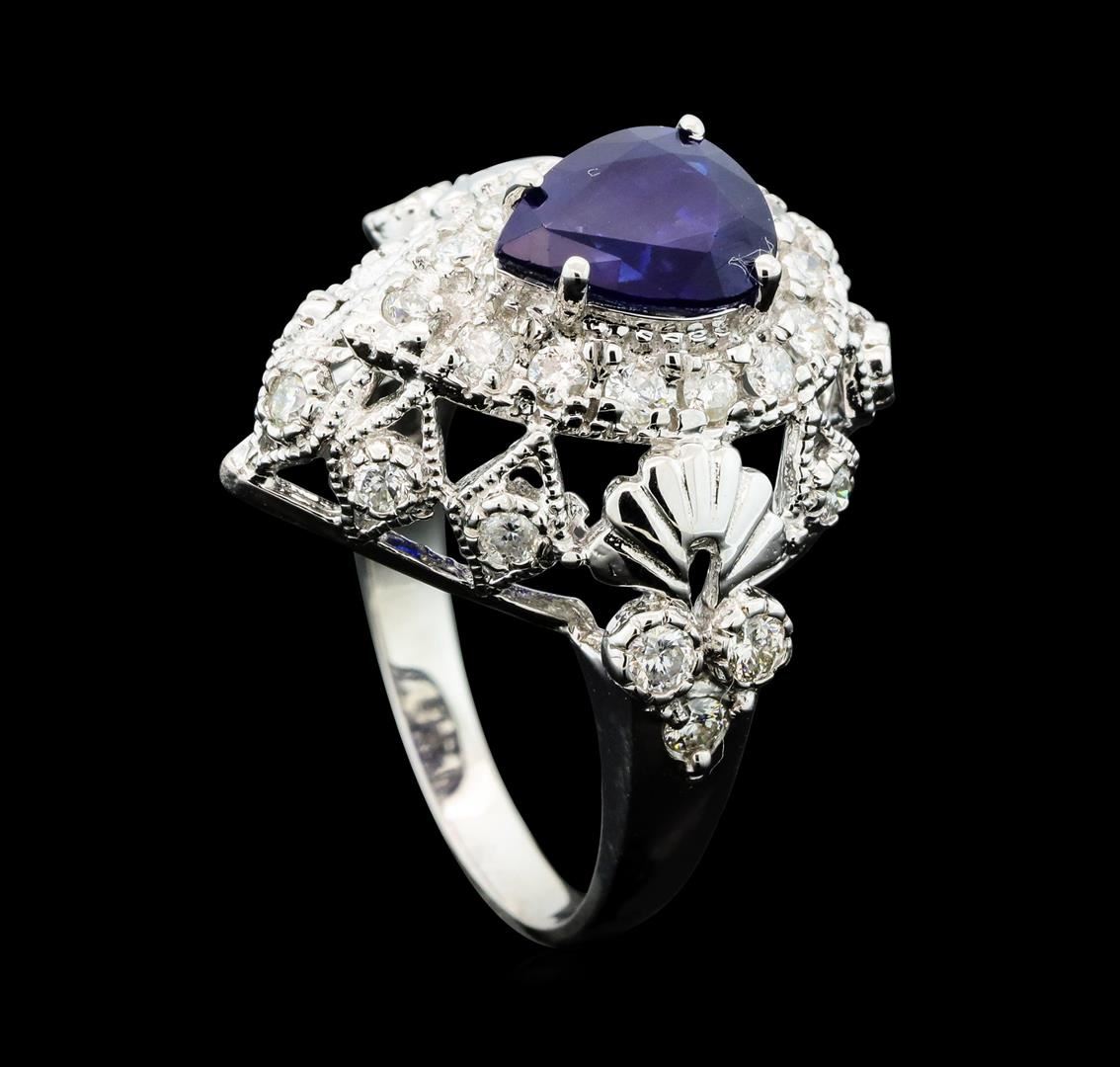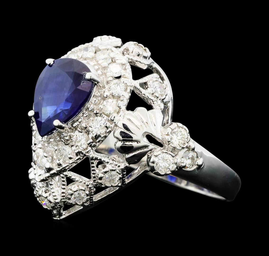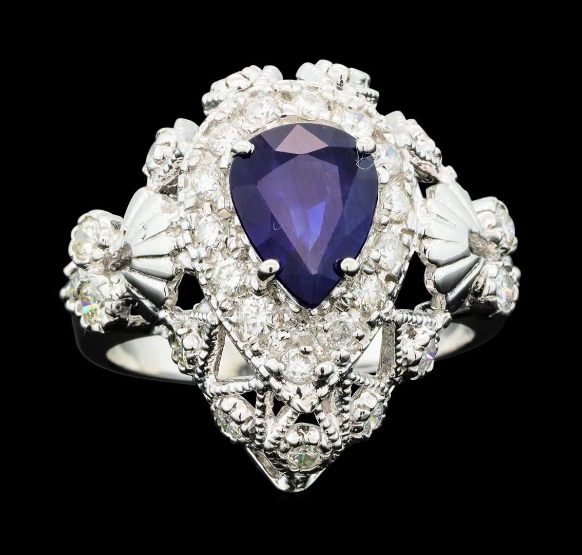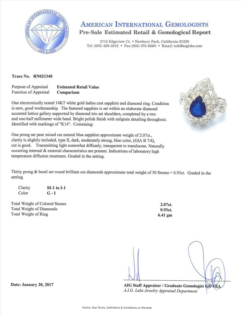 One electronically tested 14KT white gold ladies cast sapphire and diamond ring. The featured sapphire is set within an elaborate diamond accented lattice gallery supported by diamond trio set shoulders, completed by a two and one-half millimeter wide band. Bright polish finish with milgrain detailing throughout. Identified with markings of "K14". Condition is new, good workmanship. Containing: One prong set pear mixed cut natural blue sapphire approximate weight of 2.07ct., clarity is slightly included, type II, dark, moderately strong, blue color, (GIA B 7/4), cut is good. Transmitting light somewhat diffusely, transparent to translucent. Naturally occurring internal & external characteristics are present. Indications of laboratory hightemperature diffusion treatment. Graded in the setting.Thirty prong & bezel set round brilliant cut diamonds approximate total weight of 30 Stones = 0.93ct. Graded in the setting. Clarity: SI-1 to I-1. Color: G - I. Total Weight of Colored Stones 2.07ct. Total Weight of Diamonds 0.93ct. Total Weight of Ring 6.41gm. AIG Appraised.
