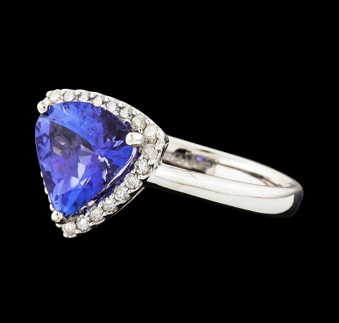 Fourteen karat (14K) white gold tanzanite and diamond ring. A trillion cut tanzanite zoisite gemstone is prong mounted in the center of the ring. Round brilliant cut diamonds accent the ring around and on both sides of the center gemstone. The ring is cast stamped "14K' and has a gross weight of 3.3 Grams. Diamonds with a total weight of 0.20cts with a clarity of (I1) and color of (H-J). Tanzanite with a total weight of 2.08cts. Earrings with a total weight of 3.3 grams. GA Appraised.