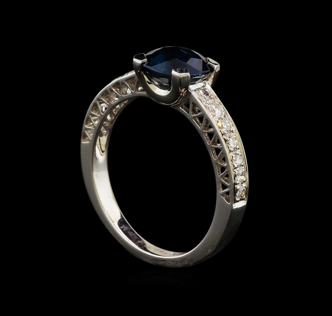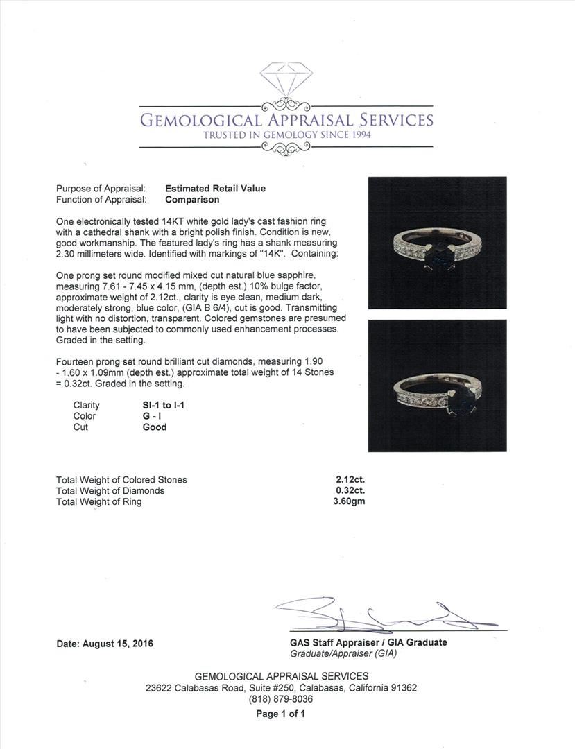 One electronically tested 14KT white gold lady's cast fashion ring with a cathedral shank with a bright polish finish. The featured lady's ring has a shank measuring 2.30 millimeters wide. Identified with markings of "14K". Condition is new, good workmanship. Containing: One prong set round modified mixed cut natural blue sapphire, measuring 7.61 - 7.45 x 4.15 mm, (depth est.) 10%. bulge factor, approximate weight of 2.12ct., clarity is eye clean, medium dark, moderately strong, blue color, (GIA B 6/4), cut is good. Transmitting light with no distortion, transparent. Colored gemstones are presumed to have been subjected to commonly used enhancement processes. Graded in the setting.Fourteen prong set round brilliant cut diamonds, measuring 1.90 - 1.60 x 1.09mm (depth est.) approximate total weight of 14 Stones = 0.32ct. Graded in the setting. Clarity: SI-1 to I-1. Color: G - ICut Good. Total Weight of Colored Stones 2.12ct. Total Weight of Diamonds 0.32ct. Total Weight of Ring 3.60gm. GAS Appraised.