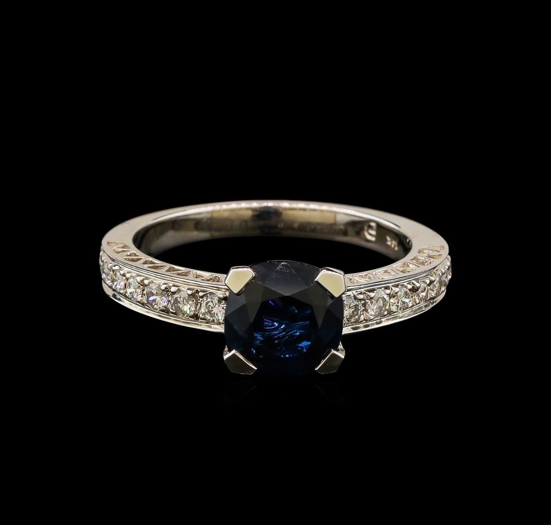 One electronically tested 14KT white gold lady's cast fashion ring with a cathedral shank with a bright polish finish. The featured lady's ring has a shank measuring 2.30 millimeters wide. Identified with markings of "14K". Condition is new, good workmanship. Containing: One prong set round modified mixed cut natural blue sapphire, measuring 7.61 - 7.45 x 4.15 mm, (depth est.) 10%. bulge factor, approximate weight of 2.12ct., clarity is eye clean, medium dark, moderately strong, blue color, (GIA B 6/4), cut is good. Transmitting light with no distortion, transparent. Colored gemstones are presumed to have been subjected to commonly used enhancement processes. Graded in the setting.Fourteen prong set round brilliant cut diamonds, measuring 1.90 - 1.60 x 1.09mm (depth est.) approximate total weight of 14 Stones = 0.32ct. Graded in the setting. Clarity: SI-1 to I-1. Color: G - ICut Good. Total Weight of Colored Stones 2.12ct. Total Weight of Diamonds 0.32ct. Total Weight of Ring 3.60gm. GAS Appraised.