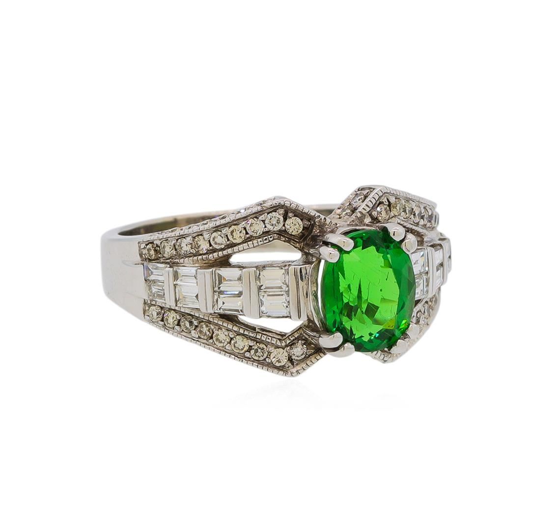 One electronically tested 14KT white gold lady's cast fashion ring with a cathedral split shank with a bright polish with milgrain detailing finish. The featured lady's ring has a shank measuring 2.86 millimeters wide. Identified with markings of "14K". Condition is new, good workmanship. Containing: One prong set oval modified brilliant cut natural tsavorite garnet, measuring 7.76 x 6.62 x 4.69mm, (depth est.) 15%. bulge factor, approximate weight of 2.12ct., clarity is eye clean, medium, moderately strong, slightly yellowish green color, (GIA slyG 5/4), cut is good. Transmitting light with no distortion, transparent. Colored gemstones are presumed to have been subjected to commonly used enhancement processes. Graded in the setting.Seventy-Two prong set round brilliant cut diamonds, measuring 1.30 - 1.20 x 0.78mm (depth est.) approximate total weight of 72 Stones = 0.54ct. Graded in the setting. Clarity: SI-1 to SI-2. Color: H - ICut Good Sixteen channel set baguette cut diamonds, measuring from 2.00 x 1.10 x 0.94mm (depth est.) to 2.10 x 1.40 x 1.19mm (depth est.) approximate total weight of 16 Stones = 0.42ct. Graded in the setting. Clarity: VS-1 to VS-2. Color: H - JCut Good. Total Weight of Colored Stones 2.12ct. Total Weight of Diamonds 0.96ct. Total Weight of Ring 6.50gm. GAS Appraised.