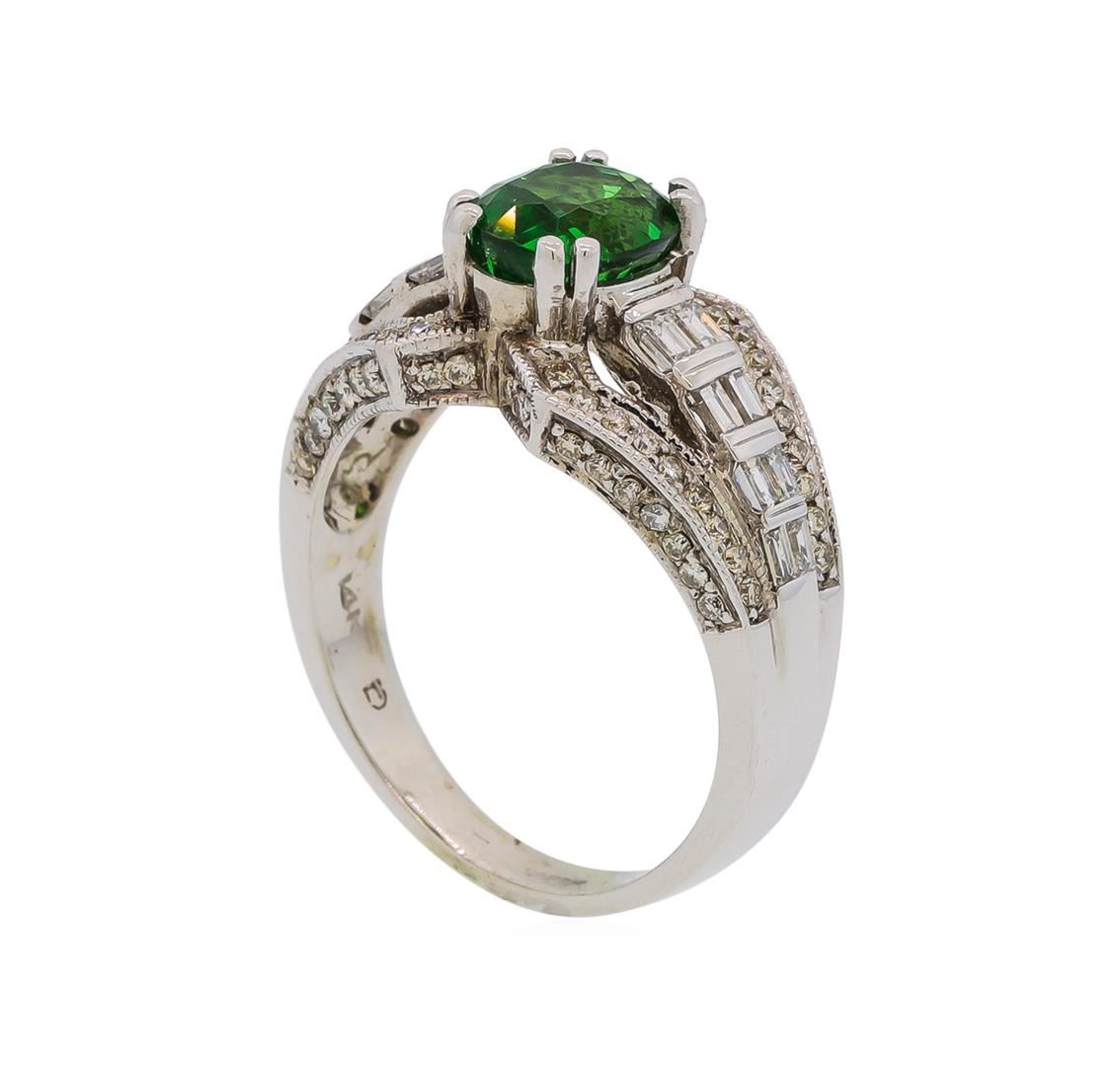 One electronically tested 14KT white gold lady's cast fashion ring with a cathedral split shank with a bright polish with milgrain detailing finish. The featured lady's ring has a shank measuring 2.86 millimeters wide. Identified with markings of "14K". Condition is new, good workmanship. Containing: One prong set oval modified brilliant cut natural tsavorite garnet, measuring 7.76 x 6.62 x 4.69mm, (depth est.) 15%. bulge factor, approximate weight of 2.12ct., clarity is eye clean, medium, moderately strong, slightly yellowish green color, (GIA slyG 5/4), cut is good. Transmitting light with no distortion, transparent. Colored gemstones are presumed to have been subjected to commonly used enhancement processes. Graded in the setting.Seventy-Two prong set round brilliant cut diamonds, measuring 1.30 - 1.20 x 0.78mm (depth est.) approximate total weight of 72 Stones = 0.54ct. Graded in the setting. Clarity: SI-1 to SI-2. Color: H - ICut Good Sixteen channel set baguette cut diamonds, measuring from 2.00 x 1.10 x 0.94mm (depth est.) to 2.10 x 1.40 x 1.19mm (depth est.) approximate total weight of 16 Stones = 0.42ct. Graded in the setting. Clarity: VS-1 to VS-2. Color: H - JCut Good. Total Weight of Colored Stones 2.12ct. Total Weight of Diamonds 0.96ct. Total Weight of Ring 6.50gm. GAS Appraised.